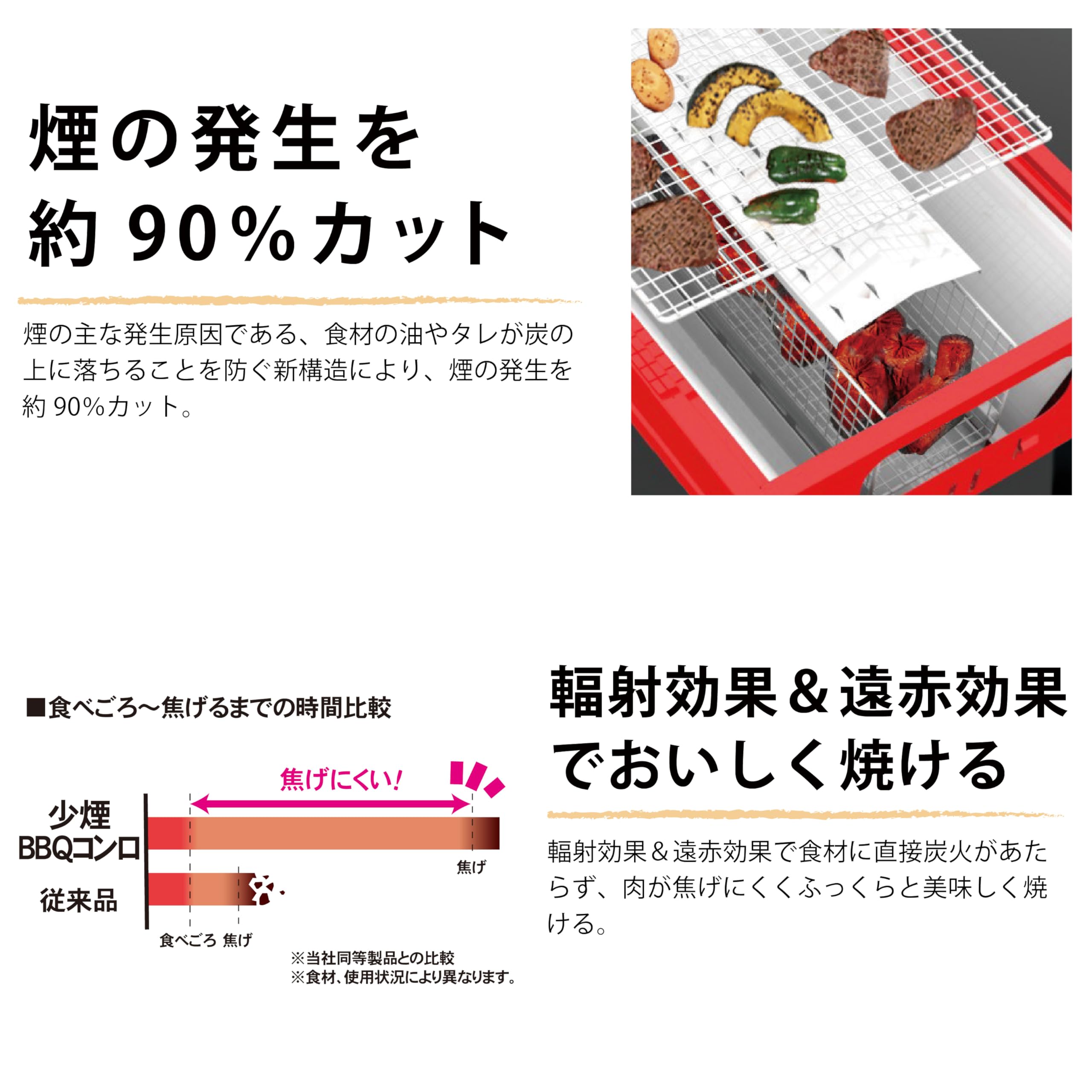 【煙の発生を約90%カット】直接炭に油が落ちない新構造、煙の原因になる油が燃えないので煙を抑えることができます。周りを気にすることなくBBQを楽しめ、また服にニオイが付くことも防ぎます。【食材が焦げにくい】輻射効果&遠赤効果で食材に直接炭火があたらず肉が焦げずにふっくらと美味しく焼けます。【後片付けラクラク】炭が火床にまとまっているため、灰捨ての後処理がカンタンに行えます。【コンロの高さ変更可能】コンロの高さを2段階で調節できます。ご使用シーンに合わせてご活用くださいませ。【鉄板付き】ハーフ鉄板が1枚付属しており、焼きそば等の料理を楽しむこともできます。ハーフサイズのため、鉄板焼きと網焼きを同時に楽しむことができます。【サイズ】本体/約W83.5×D47×H34(69.5)cm、火床/約W59.5×D11×H10cm、ハーフ鉄板/約W36×D33×H2cm、ハーフ網/約W31×D29.5cm【重量】約6.3kg【材質】本体/スチール(焼付塗装仕上)、網/クロムメッキ【セット内容】本体×1、脚×4本(2WAY)、ハーフ網(C-32)×2枚、ハーフ鉄板(GS-36F)×1枚【使用人数】5~7人