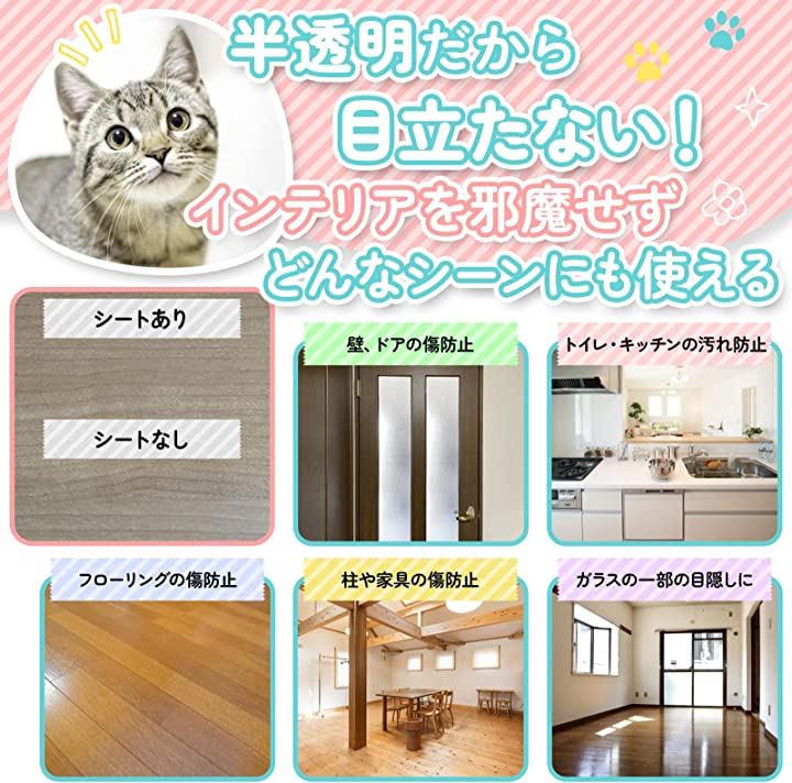 猫ちゃんの爪とぎ、ひっかき防止、ワンちゃんのいたずら防止に、壁紙保護シート目立たない半透明素材のため、ペットのひつけ・ひっかき防止、トイレやキッチンの汚れ防止、子供のいたずら書き防止など様々な用途で使える。