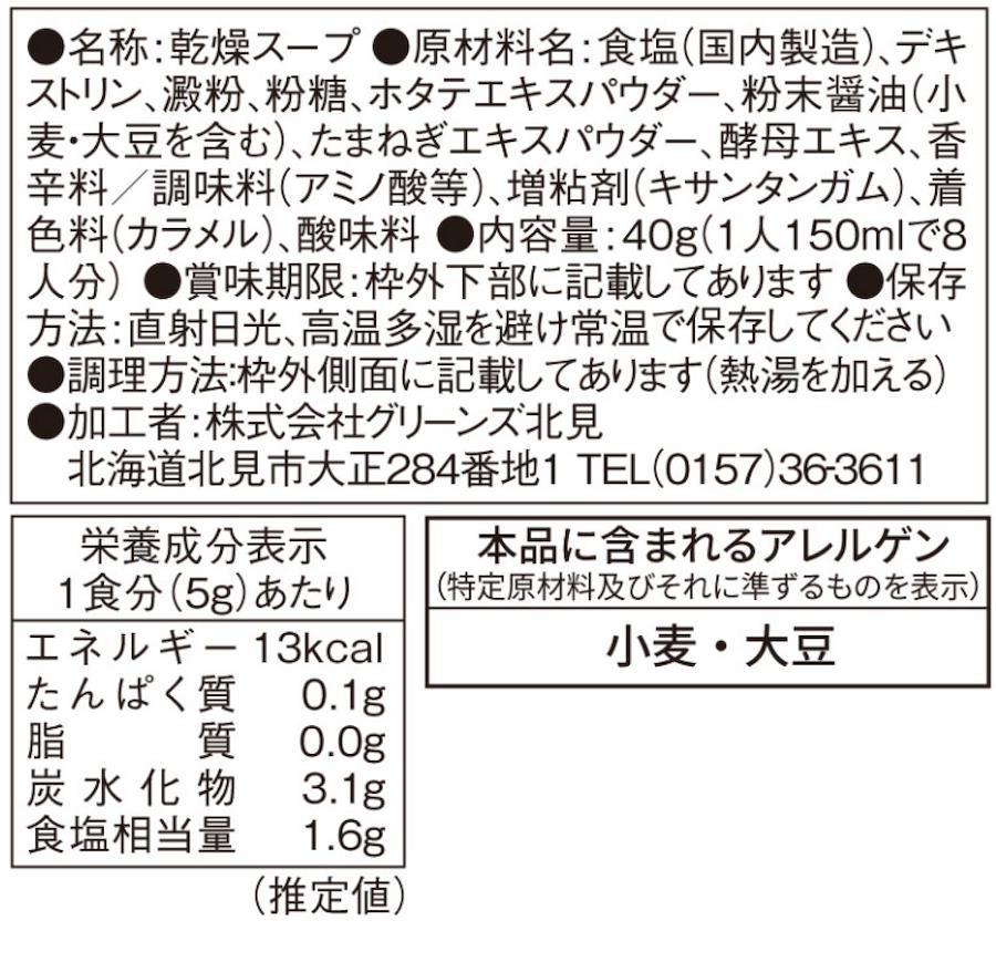 食塩(国内製造)、デキストリン、澱粉、粉糖、ホタテエキスパウダー、粉末醤油(小麦・大豆を含む)、オニオンエキスパウダ―、酵母エキス、香辛料/調味料(アミノ酸等)、増粘剤(キサンタンガム)、着色料(カラメル)、酸味料