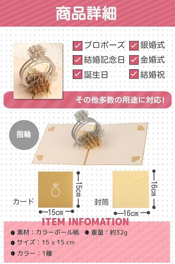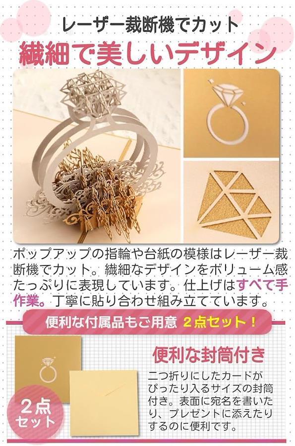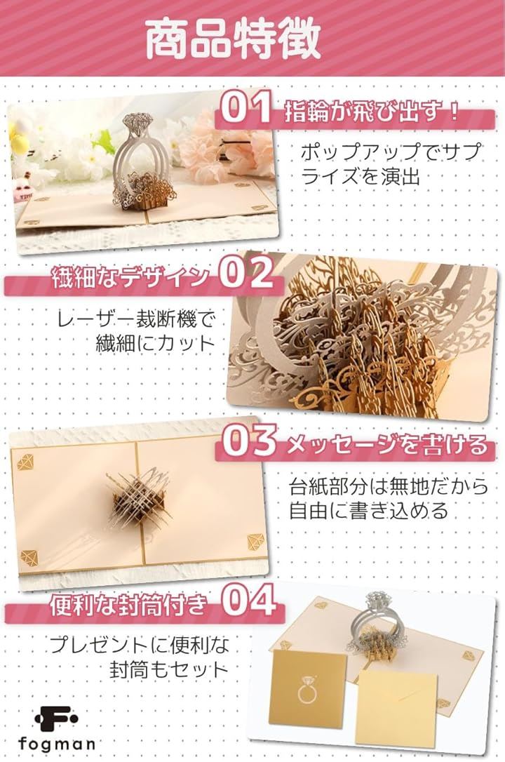 「商品特徴」(1)指輪が飛び出す。:ポップアップでサプライズを演出/(2)繊細なデザイン:レーザー裁断機で繊細にカット/(3)メッセージを書ける:台紙部分は無地だから自由に書き込める/(4)便利な封筒付き:プレゼントに便利な封筒もセット