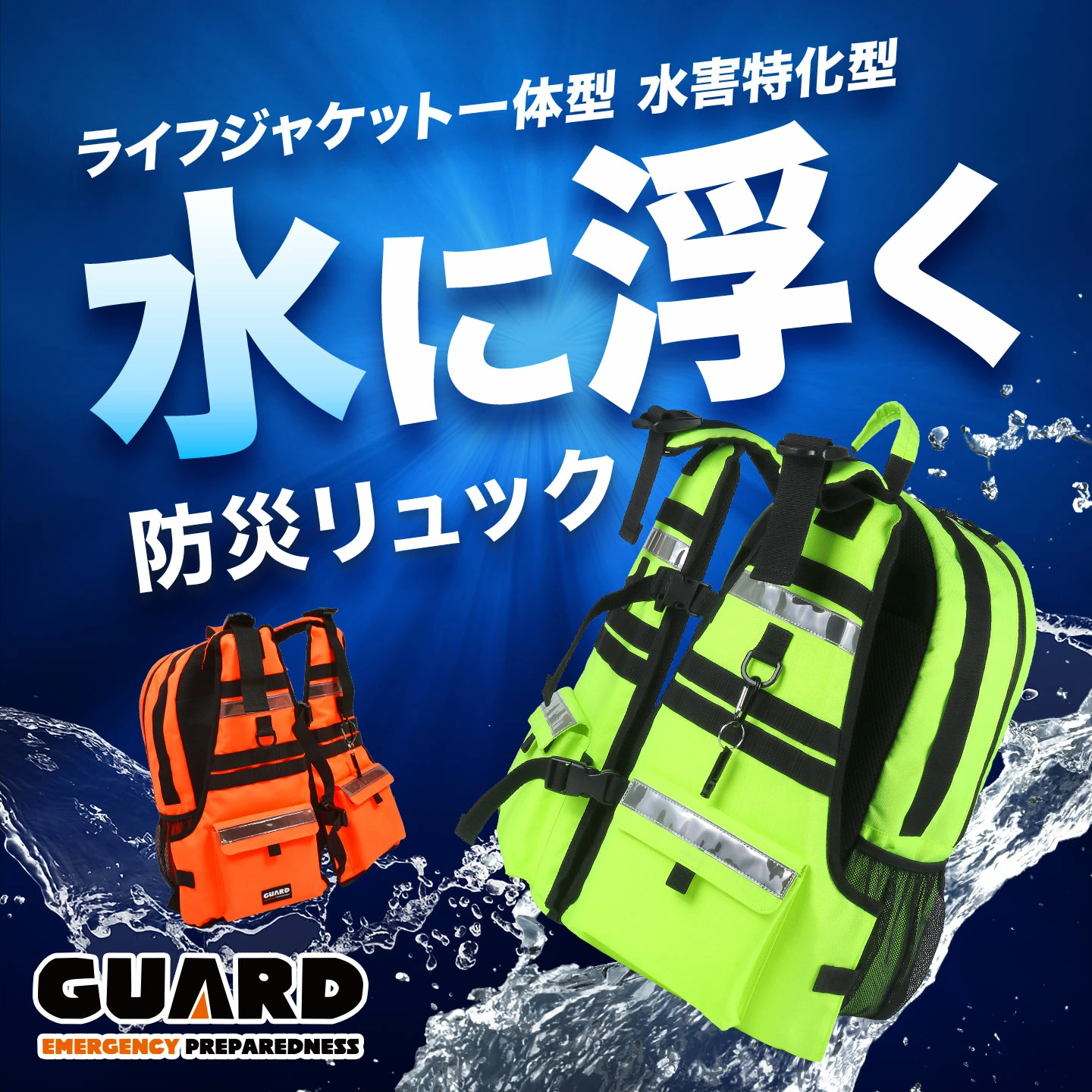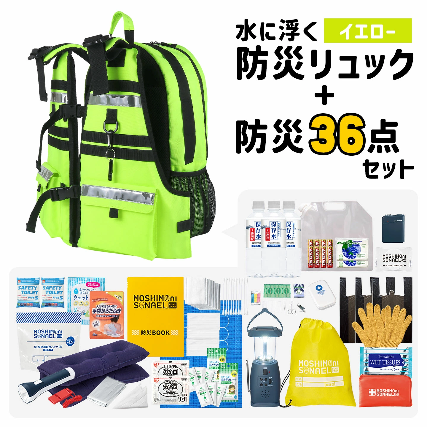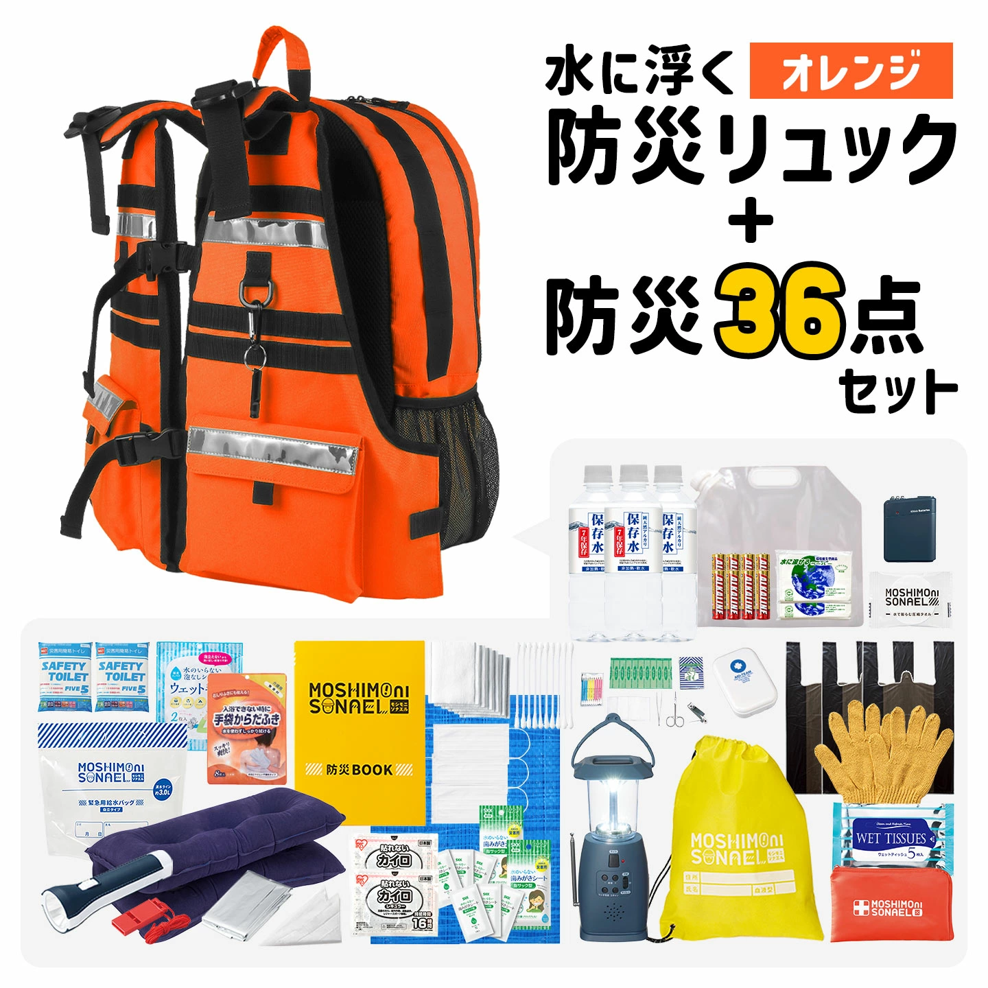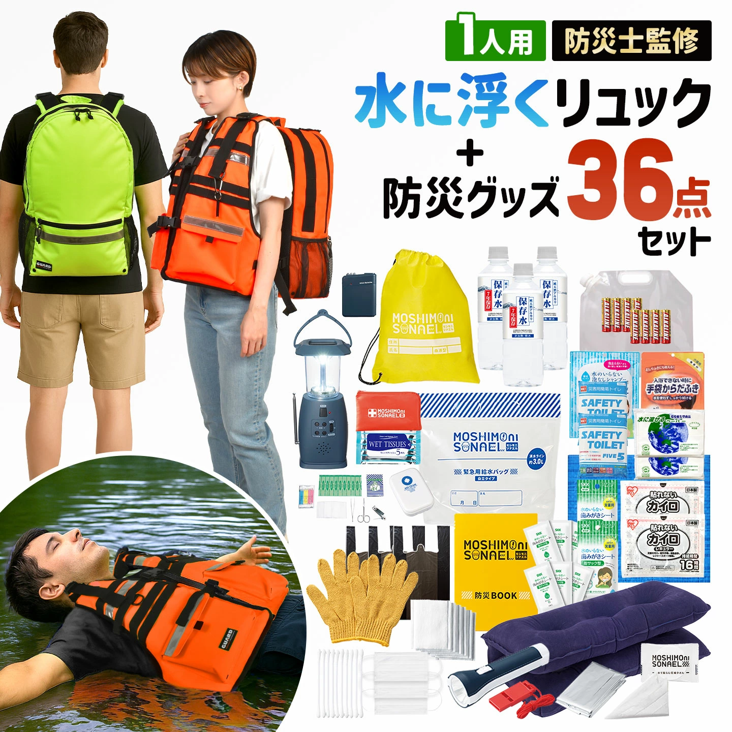水害にも対応!浮く防災リュックに、防災士監修の必須グッズ36点をセットした安心の1人用パック。(2カラーから選べます)