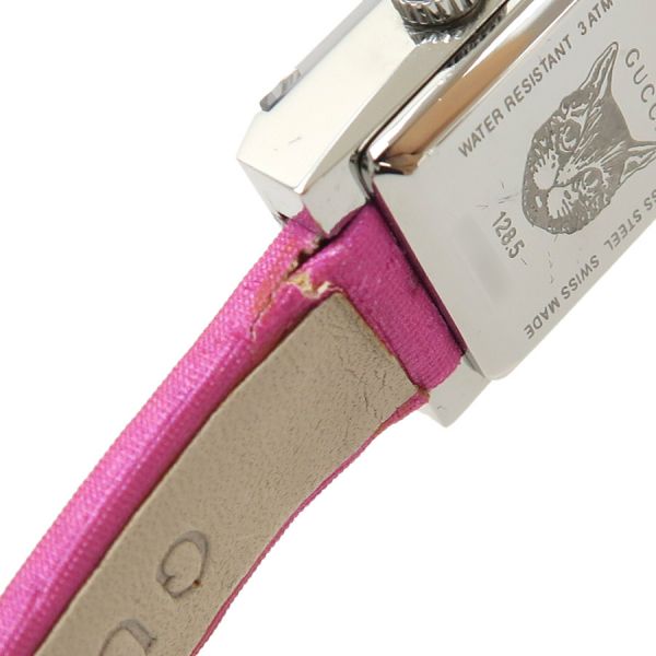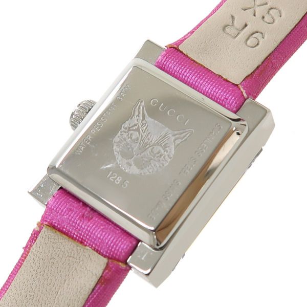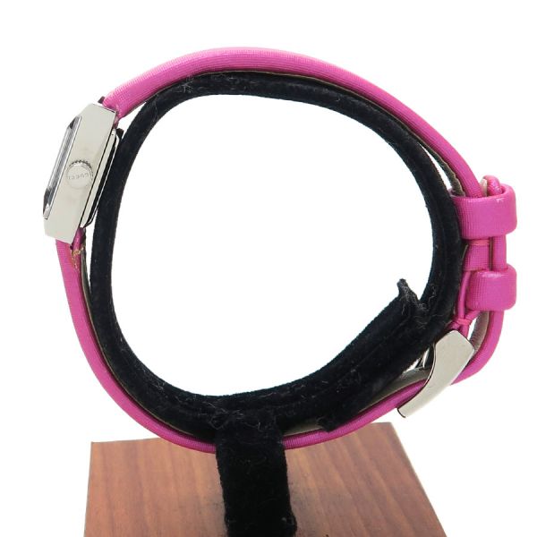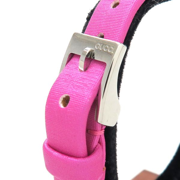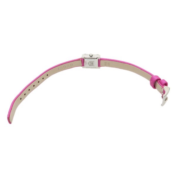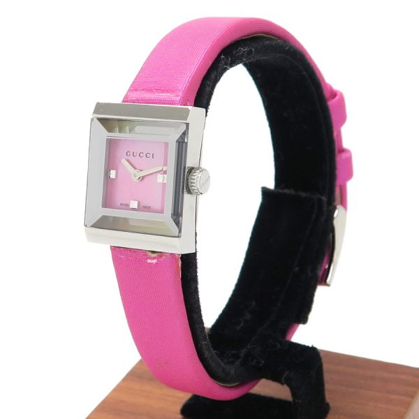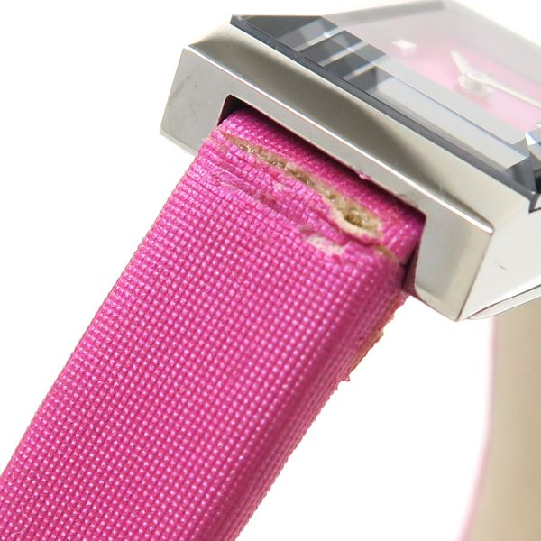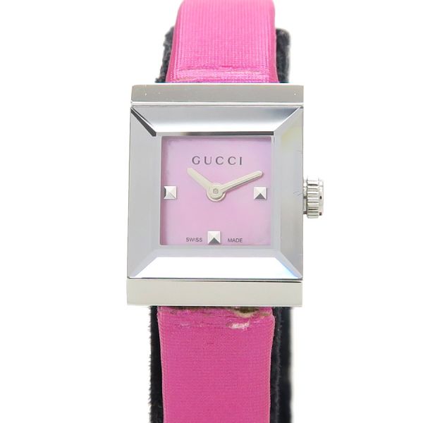 グッチ Gフレームグッチ Gフレーム、クォーツ、レディースモデル、腕時計のご紹介です。文字盤はシェル、2針。少し縦長の角型のSSケース、ベルトはピンクの表側はサテン、裏側はアイボリーカラーのレザー仕様、GUCCIロゴの刻印があります☆状態はBランク。本体ケースなどには大きなダメージは無く、ベルトにダメージがあり、薄汚れ、ベルトの本体との付け根部分周りに裂け、捲れなどがありの為、割り切りのバーゲンプライスです☆