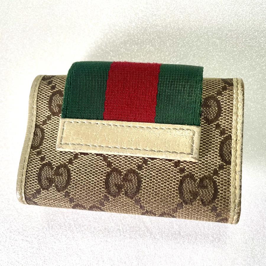 ☆こちらの商品はUSED品ですので新品や未使用品をお求めの方はご遠慮ください。GGキャンバスとストライプデザインのGucciキーケース、カードスロット付きで実用的。