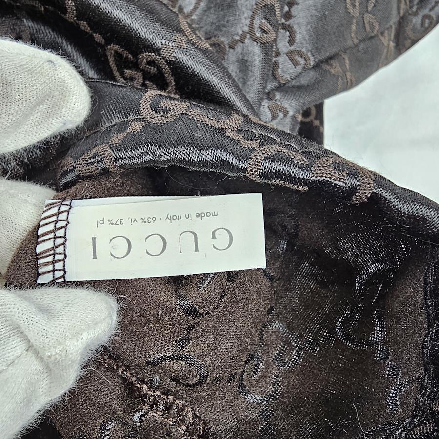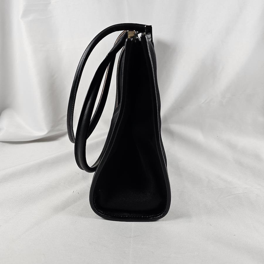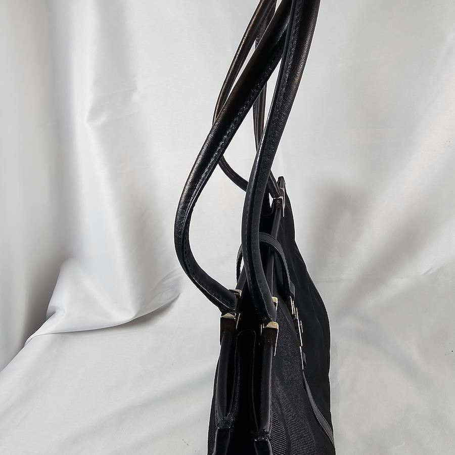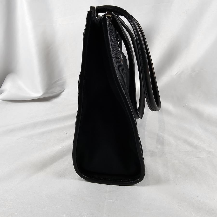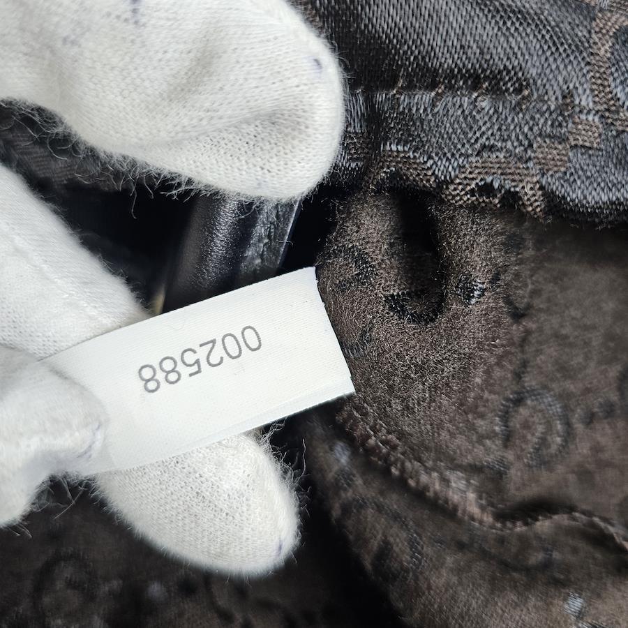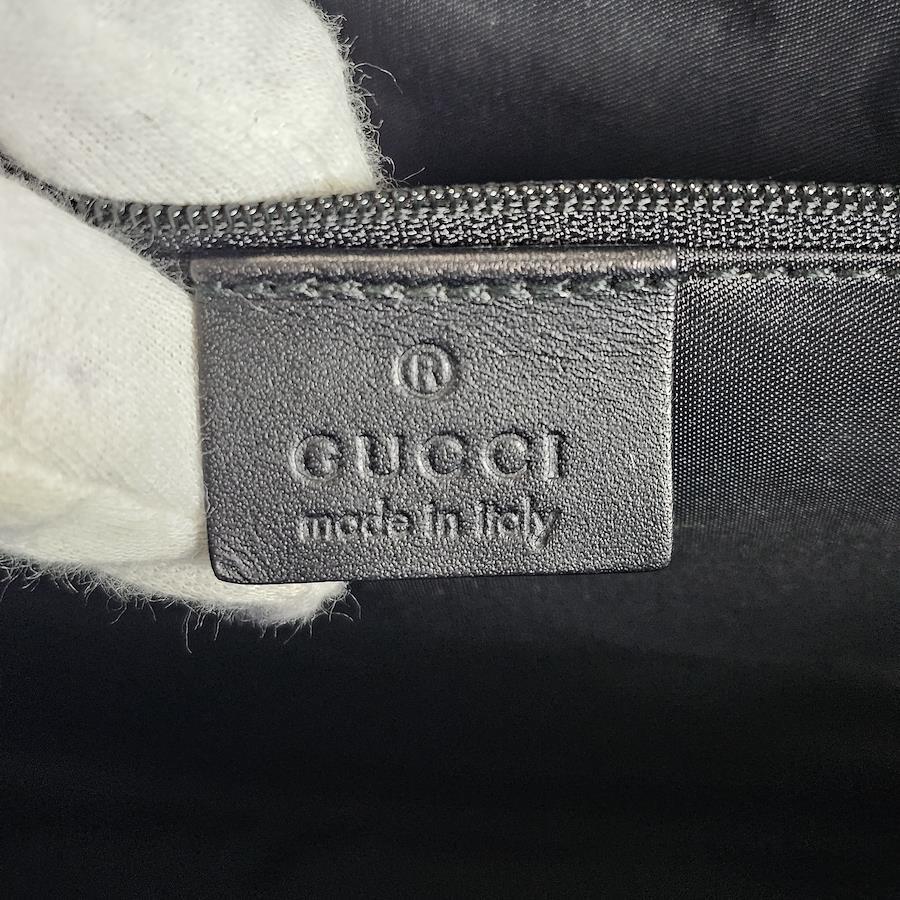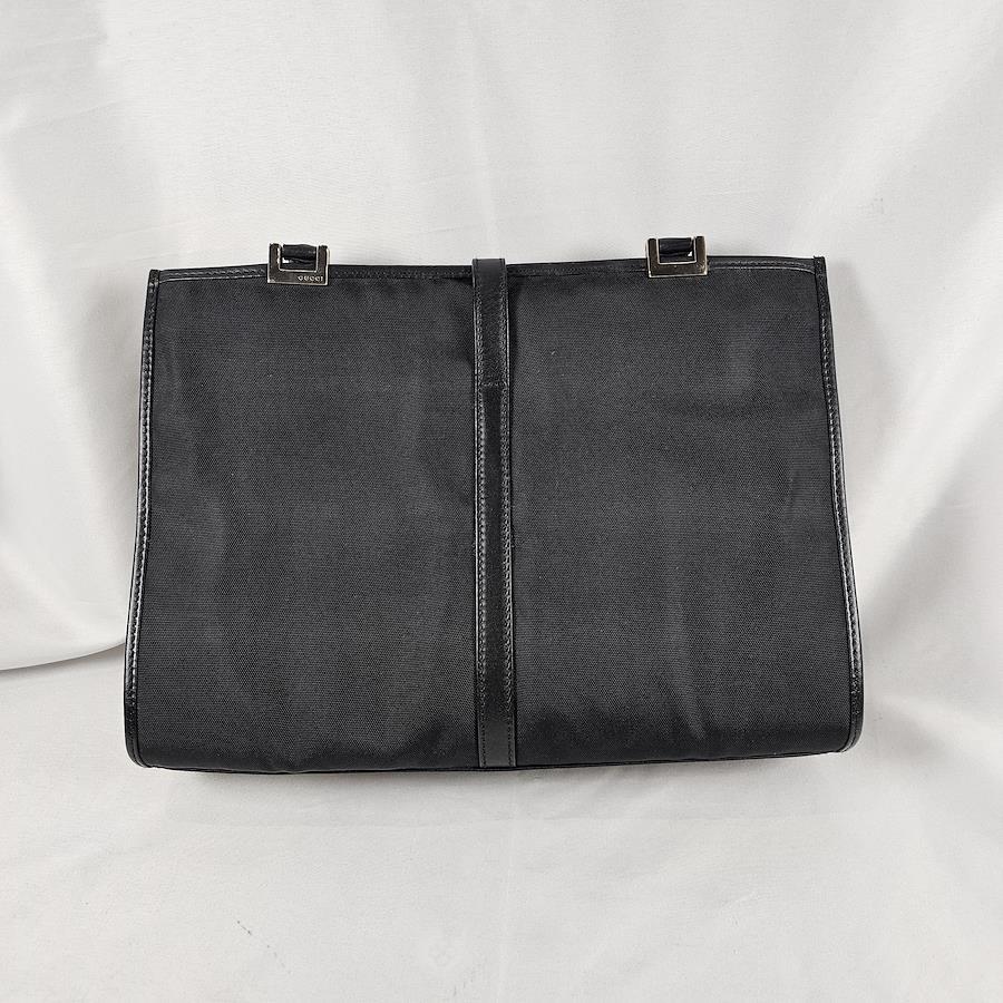 シックなブラックのキャンバス地(またはナイロン地)に、シルバーのジャッキー金具とレザーのトリミングが洗練された印象を与えます。A4サイズに近いサイズ感で、日常使いからビジネスシーンまで幅広く活躍するデザインです。グッチの中でも特に人気があり、時代を超えて愛されている定番モデルです。