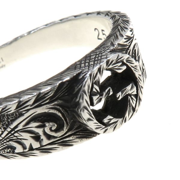 ■採寸#25 日本サイズ:約24号 幅:0.3~0.8cm■素材Ag925■コメントグッチからSVリングが入荷しました!アラベスク柄のエングレービングが施された、インターロッキングGのシルバーリングです☆全体に極細かいスレやシルバー特有のくすみ・燻しの色落ちが見受けられる為Bランクでのご紹介です。燻しが落ちたことで本来の重厚感が失われておりますが、クリーンでシャープなデザインがお好みの方には良いかと思います◎※リングは日本サイズ表記になります。