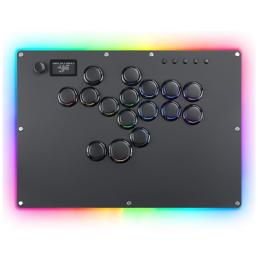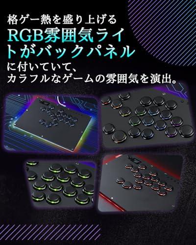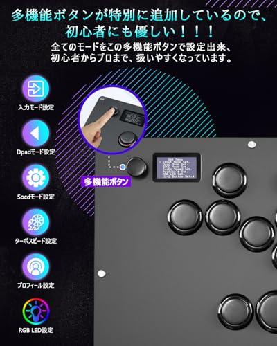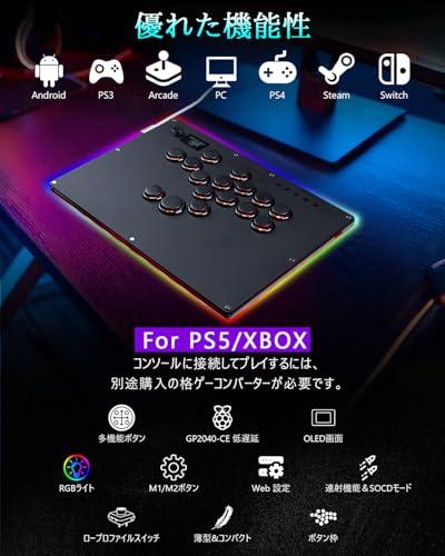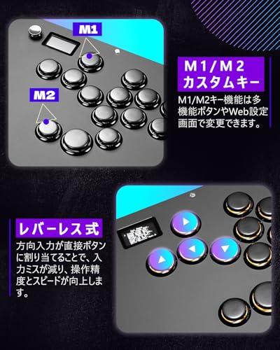 【業界初の多機能メニューボタン搭載】業界初のオールインワンボタンを備えたレバーレスコントローラー、全ての機能をワンメニューボタンで設定可能、入力モード、Dpadモード、Socdモード、ターボスピード、プロフィール、RGB LEDなど。初心者からプロまで、誰でも使いやすいデザインになっています。このレバーレスアケコンは、競技シーンでの使用に最適化された格闘ゲーム用入力デバイスです。 【最大の利点】すべての機能をワンメニューボタンで設定可能、一般的なアーケード筐体よりも押し心地が抜群。ボタンリムの追加とマットな仕上げで、運指が本当に絶秒。ボタン音は「スコスコ」で静か。さらに、格ゲー熱を盛り上げるRGB雰囲気ライトがバックパネルに付いていて、カラフルなゲームの雰囲気を演出します。 【高精度??高反応】方向入力が直接ボタンに割り当てることで、レバー操作よりも正確かつ高速な入力が可能です。コマンド入力や間隔管理がより速く、より正確に行えるため、間合いの取り方で勝敗を決める格ゲーに最適。また複数ハードに対応しておりWindows/PC/Switch/Steam Deck/PS3/PS4/ArcadeおよびAndroidデバイスで使用出来ます。PS5やXBOX本体に接続する際に、対応コンバーターが要ります。互換性を確保するには、PS5に対応するコンバーターやXBOXに対応するコンバーターをぜひ別途ご購入頂けます。XBOX本体のみで使用する場合はバージョンアップが必要ですが、具体的なバージョンアップ方法は商品ページに掲載されている操作動画をご覧いただけます。 【優れた機能性】デザイン面もシンプルで高級感があり、コンパクトで持ち運びにも困らずカスタム性も高いので長く使えます。方向キーを同時押しした際の細かい設定やボタンのマッピング機能や連射機能もあり機能面でも優れています。薄型かつ天面が広いので操作性や使い勝手も抜群に良い。左上には液晶ディスプレイ付きで、ボタン入力を直感的に確認可。またキースイッチのホットスワップに対応しており簡単に別のキースイッチに交換出来ます。アクリル板で基盤を挟んだシンプルな構造ですが、非常にきれいなつくり、裏面がマットなクリア素材で基盤が透けて見えます。 【低遅延&静音】アケコンの悩み「音」を解消した。レバーレスの方が音は抑えられているけど、格闘ゲームはボタンを連打するから、周りの人がうるさいと感じることもある。その音で自分の戦略が漏れる可能性もある。でも、「音」に関しては、キーボードメーカーの技術が活かされている。これまでの開発経験から、内部構造に最適な静音設計が施されているので、心地よい打鍵音を楽しんでほしい。基盤が低遅延のRaspberry Pi Pico GP2040-CEを搭載、全てのモードでの入力遅延が1ms以内で、超高速ポーリングレートを実現します。 【GK-16黒のパッケージ内容】製品サイズ 300*210*10mm、重さ866g。ボタンサイズ 大きめ25.8mm 小さめ20.7mm ①USB-C ケーブル×1、②USB延長コード×1、③スタンド*2、④滑り止めパッド×1枚、⑤ゴムマット×1枚、⑥ボタンキャップ*2、⑦ゴムキャップ*1、⑧ネジ*2、⑨キースイッチ*2