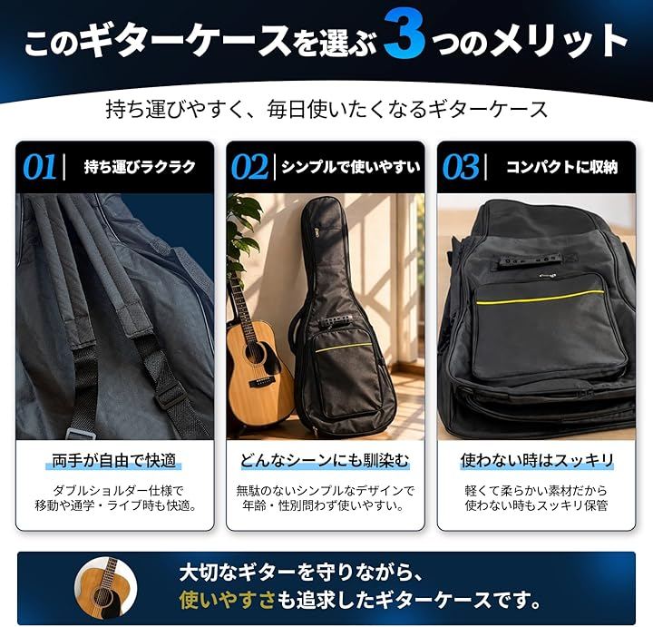 アコースティックギターやクラシックギターを安全に運べる、軽量なソフトケースです。