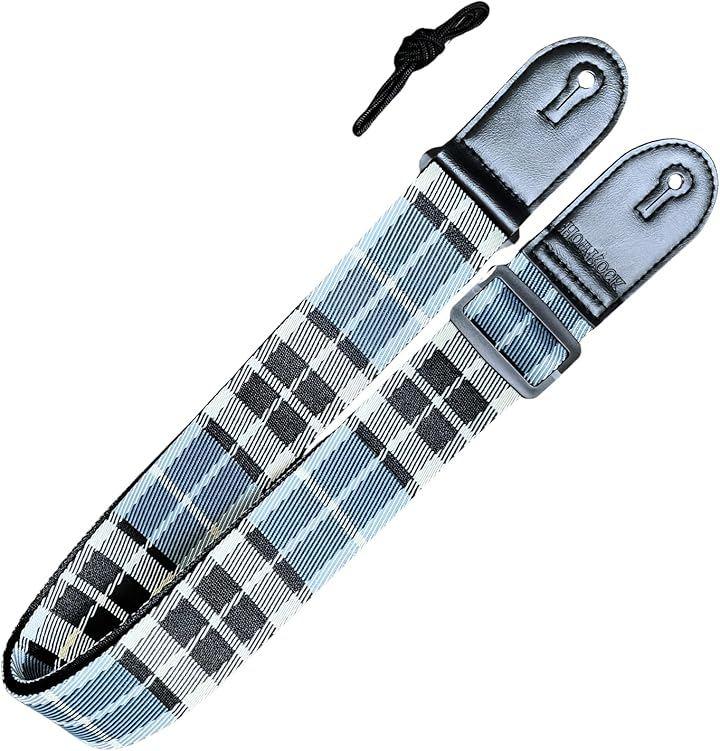 Guitar strap, checkered pattern, rock style, for electric and acoustic guitars, with attachment cord.