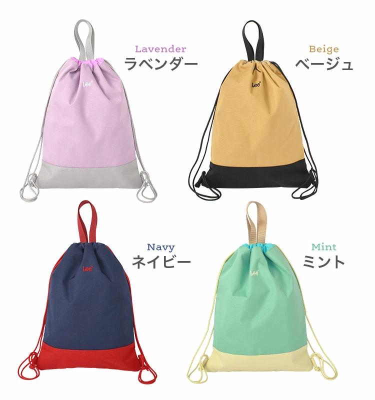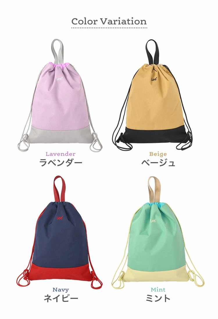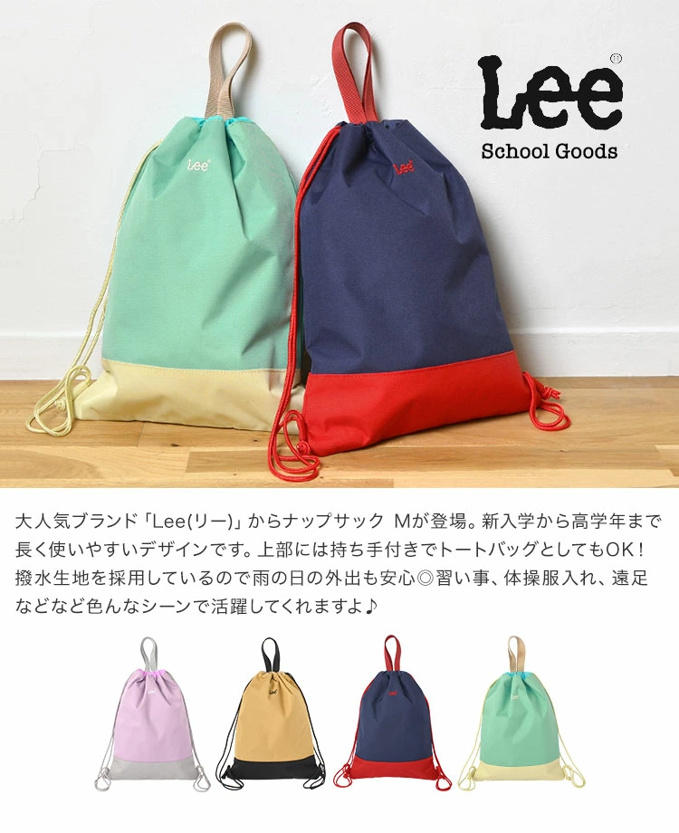 【Mサイズ ナップサック】撥水生地を使用したleeの巾着ナップサックです。入学準備にピッタリのmサイズ!大人っぽいデザインなので高学年まで使っていただけます。バイカラーデザインがおしゃれな配色で、男の子も女の子もOK!毎日の通学や塾などの習い事、ちょっとしたお出かけバッグにも◎おしゃれなデザインで重宝する形なのでプレゼントにもピッタリ♪
