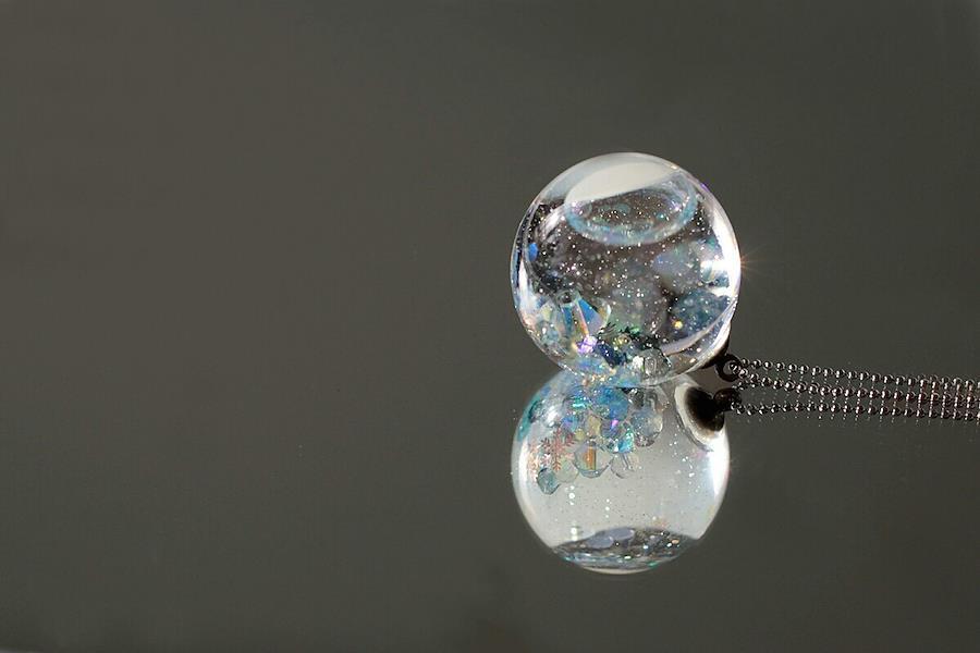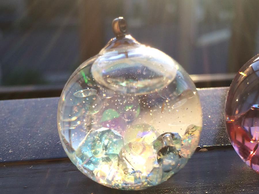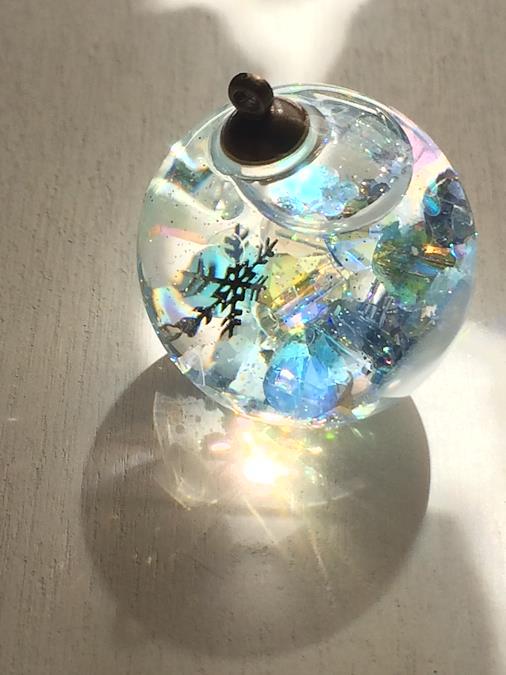 雪のスノードームのような白い作品です。中では白や薄い青、光のような薄い黄色などを織り交ぜ色を出しています。中には雪の結晶のモチーフが少し入っています。