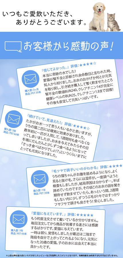 ペット用ウェットティッシュ付きセット<80枚入り> 名称:H4Oペットウォーター / 原材料:水、水素 / 内容量:100ml / 賞味期限:製造日より90日間 / 保存方法:常温保存 / ペットも大切な家族です。ペットは飼い主を選べません。だからこそ最大の愛情をもって接して欲しい。今では様々なペットフードがあります。 健康志向の物も多々見かけると思います。それだけではなく、日々飲む水にも愛情を注いでください。 たかが水。されど水。人間の体の8割は水。ペットも同じです。 人に良い水素水はペットにも良い水素水です。多くのペットに愛飲されている H4O PET ペットウォーター【水素水】を是非お買い求めください。 <ウェットティッシュ> ◇なめても安心!汚れスッキリ ◇被毛ケア ヒアルロン酸配合 ◇水99%・パラベンフリー・ノンアルコール・無香料 ◇日本製 成分:水,PG,ベンザルコニウムクロリド,防腐剤,ヒアルロン酸Na 内容量:80枚/個(サイズ125mm×200mm) 【使用上のご注意】 ・ペットのお肌に異常があるときやお肌に合わない場合には使用しないでください。 ・シートは水に溶け