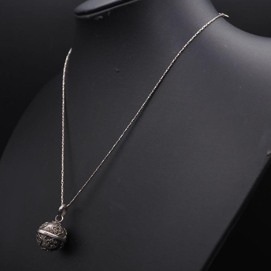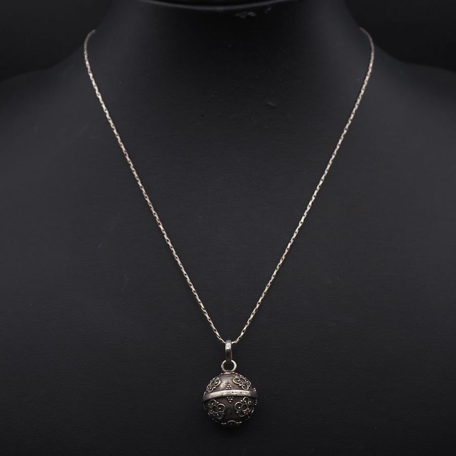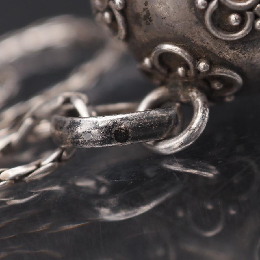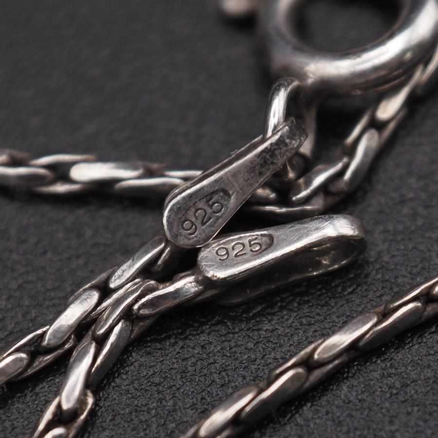 チェーンに925の刻印があります。チャームはおそらく銀製かと思いますが、刻印が無いため断言できません。画像をたくさん掲載しておりますのでそちらでご確認とご判断をお願いいたします。