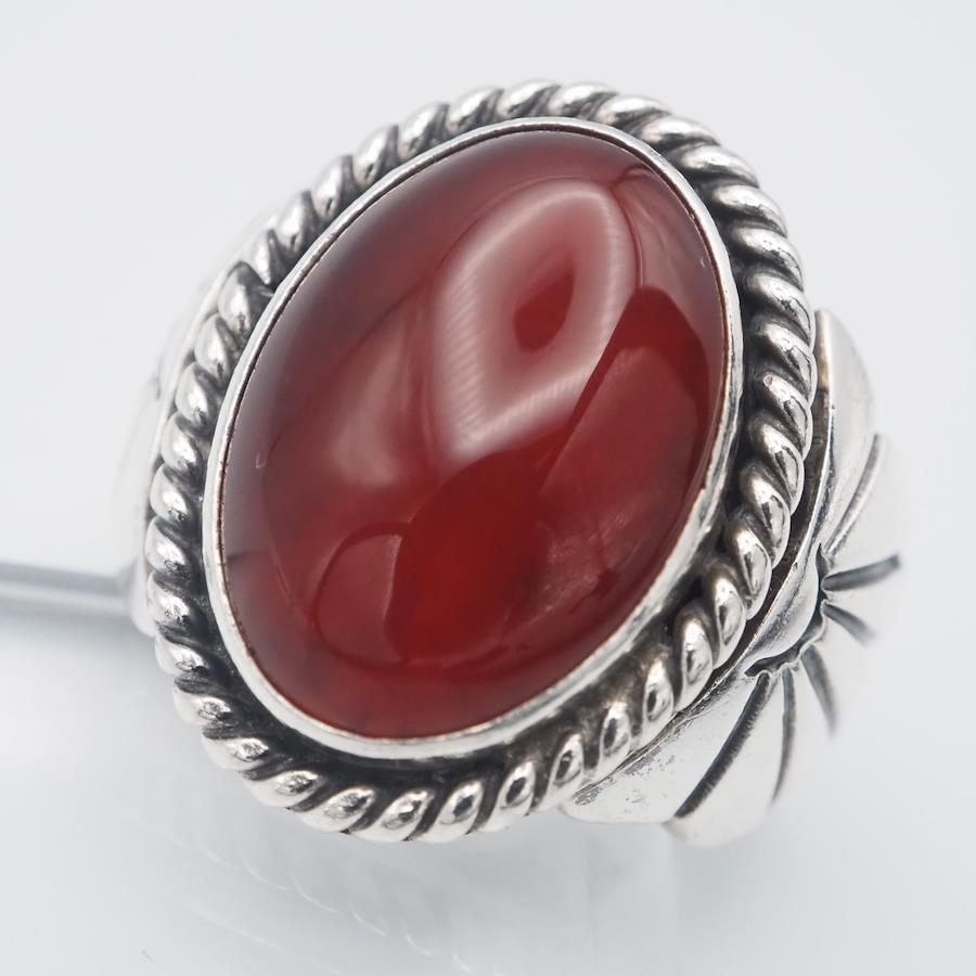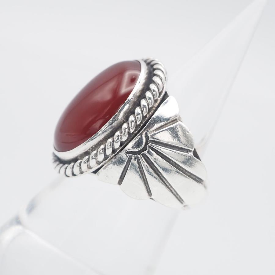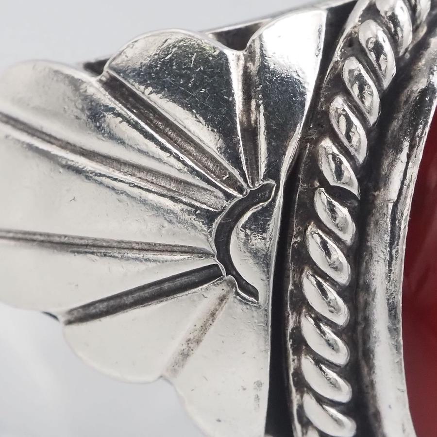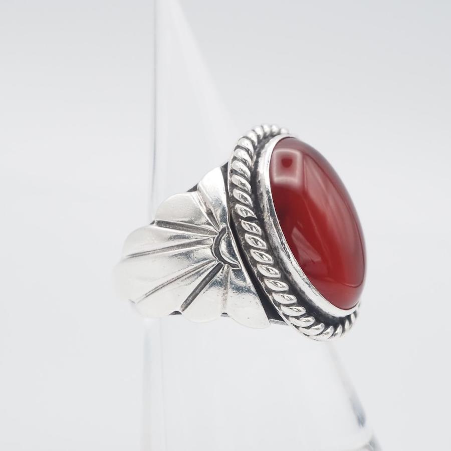 H977 Navajo Geneva Ramone Sterling Stamped Ring, Red Agate Design, Silver, Size 11