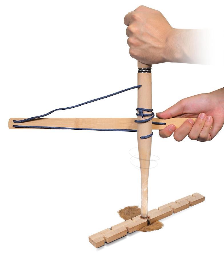 摩擦熱で着火する、昔ながらの弓きり式火起こし器。弓を素早く前後に動かし回転棒と火口をすり合わせながら火を起こします。みんなでチャレンジ、サバイバル気分で楽しめます。便利な火種付きセットで、アウトドアやバーベキューで大活躍。