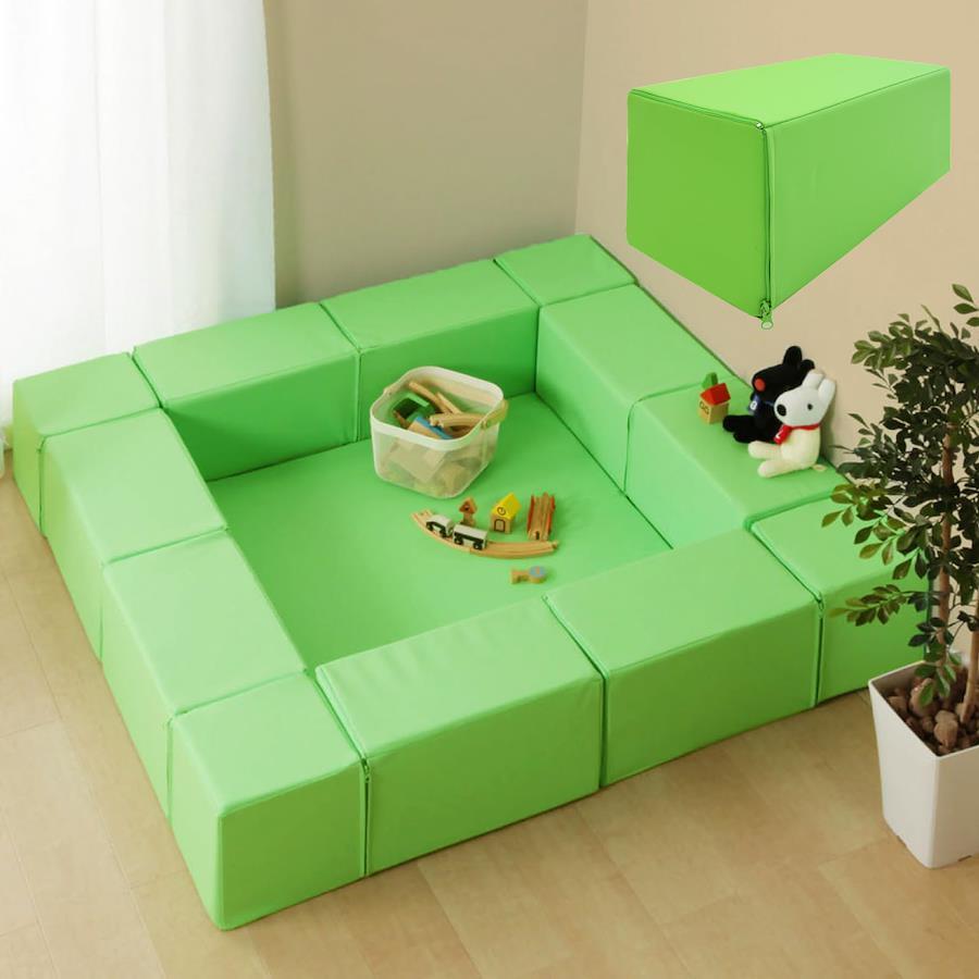 【サイズ】 長方形ブロック:約44×25×高さ25cm(1個)/【カラー】 ライトグリーン 【素材】 表面:PVC80% ポリウレタン10% ポリエステル10% 中材:ウレタンフォーム/【生産】中国製 【備考】 ※ ブロックとマット、マット同士はファスナーでつなぐことができません。 ※ つかまり立ちの時期にご使用の場合は、3種類で作る角ありタイプの組み合わせをおすすめします。正方形ブロックを使わない角なしタイプの場合、角のない部分でブロックが前に動き、転倒しやすくなる恐れがあります。 凹凸がなくさらっとした素材感です。撥水性の高い素材なのでお手入れは簡単です。 小さな子供がいる家族連れが多い店舗(車屋・工務店・美容室・ケータイショップなど)や病院の待合室のキッズコーナー・キッズスペースにおすすめです。また、ご家庭での子供スペースとしてリビングに置いて子供部屋代わりにしたり、遊び場としても使っていただけます。おもちゃの散らかりや床のキズ防止にもなります。