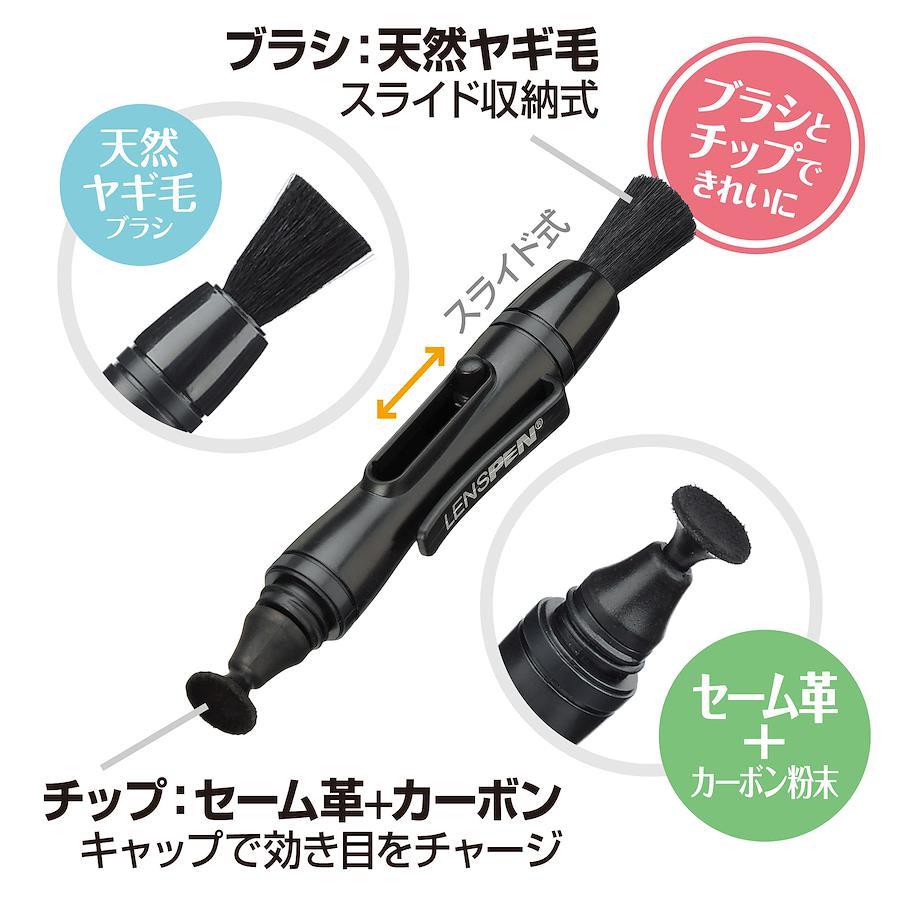 カーボン粉末とセーム革チップで指紋を拭き取る人気のレンズペン。セーム革製チップ+カーボン粉末(特許)で指紋や皮脂を残さず確実に吸収し、さらに静電気を除去してホコリをつきにくくします。