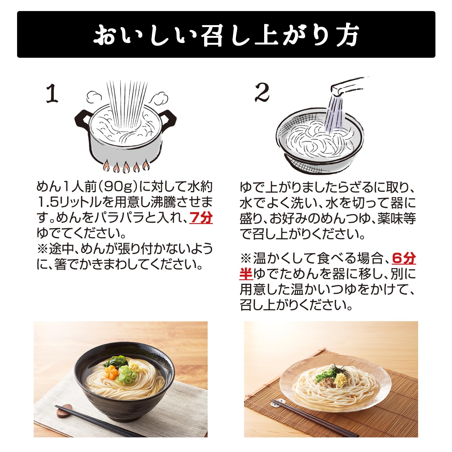 めん一人前(90g)に対して水約1.5Lを沸騰させ、めんをバラバラと入れ7分茹でる。