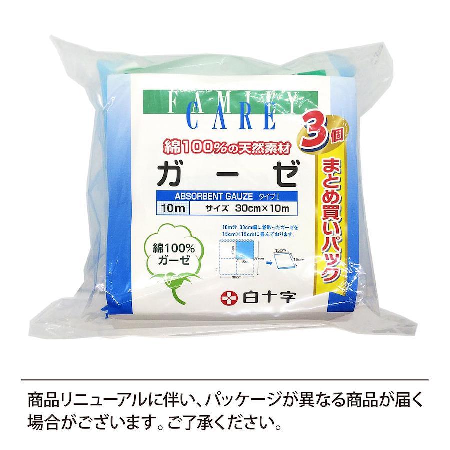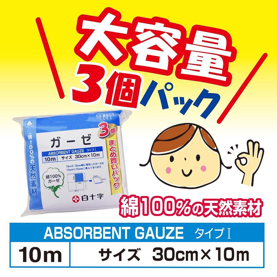 ●ガーゼサイズ:30cm×10m 【ガーゼサイズ】30(cm)×10(m) 汎用性のあるスタンダードなガーゼ3個セット。 綿を使用した天然素材で、やわらかく吸収にも優れています。 医療用にも使用できるガーゼです。 蛍光染料は不使用です。 内容量:3個 販売名:ハクジュウジガーゼ 一般医療機器届出番号:13B2X00023000037
