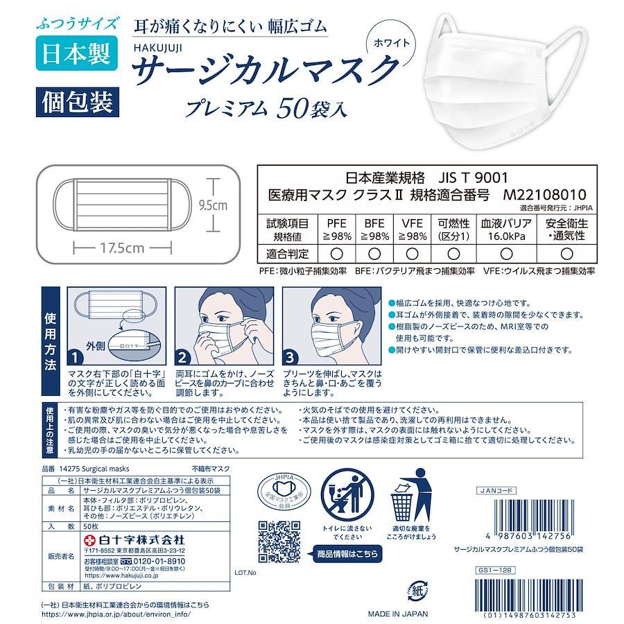 3.プリーツを伸ばし、マスクはきちんと鼻・口・あごを覆うようにします。 日本製の不織布マスクです。 【個包装パッケージ】に装着向きが表記されており、付け間違いもなく、持ち運びに便利です。 【肌ストレスを軽減】耳ゴムがマスクの外側に付いており、着用時の隙間が少なく、肌あたりが良いです。 フィットしやすい樹脂製(非金属)ノーズピース。 開けやすい開封口で保管に便利な差込口付き。 色:白 【日本産業規格(JIS T 9001)適合審査合格品】医療用マスク クラス II 規格適合番号:M22108010 内容量:1枚×50袋入【個包装】