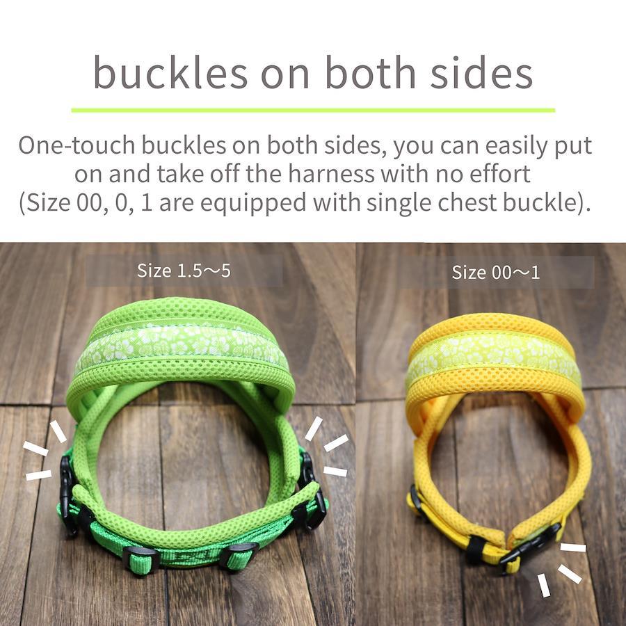 ・New Just Fit Dragon Harness ”Aloha” features a charming tropical design pattern, created by a Swedish designer, in 7 vivid and cheerful color variations.・The unique T-shaped dog harness minimizes pressure on the neck and ensures the best comfort of the dog.・The inner surface is lavishly padded with a high-quality breathable mesh fabric, soft and comfortable to the touch.・Equipped with heavy-duty plastic buckles, a soft and strong handle atop, etc.・With the newly added one-touch buckles on both sides, you can easily put on and take of the harness with no effort (sizes 00, 0, 1 are equipped with single chest buckle).・Carefully manufactured in Japan by expert craftsmen.・Available in 7 colors and 8 sizes.