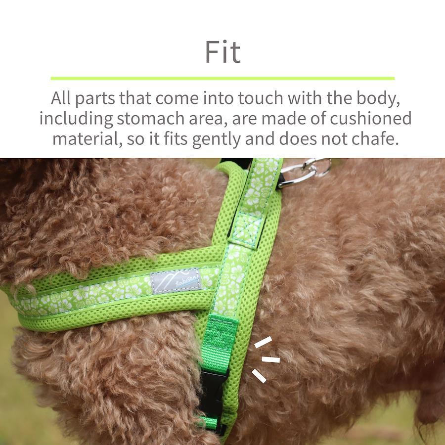 ・New Just Fit Dragon Harness ”Aloha” features a charming tropical design pattern, created by a Swedish designer, in 7 vivid and cheerful color variations.・The unique T-shaped dog harness minimizes pressure on the neck and ensures the best comfort of the dog.・The inner surface is lavishly padded with a high-quality breathable mesh fabric, soft and comfortable to the touch.・Equipped with heavy-duty plastic buckles, a soft and strong handle atop, etc.・With the newly added one-touch buckles on both sides, you can easily put on and take of the harness with no effort (sizes 00, 0, 1 are equipped with single chest buckle).・Carefully manufactured in Japan by expert craftsmen.・Available in 7 colors and 8 sizes.