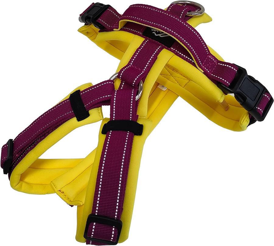 ・The inside is lavishly padded with soft cushion material, ensuring the best wearing comfort of your dog.・The innovative comfort-centered design reduces pulling, strain, constriction or any other pressure on the dog’s neck and trachea and allows the harness to stay in the right position.・Features a high-quality neoprene fabric with fast-drying function.・Adjustable on both neck and chest. Easy to fit on for many breeds.・Easy to attach/detach by using side buckles. No need to lift up the legs.・With a convenient handle. (Tiny,XXS size has no handle)・Available in a wide range of color options: the lineup includes bright, cheerful or dark tones, classical plain colors, various denim designs, and the traditional Japanese arabesque “Karakusa”.