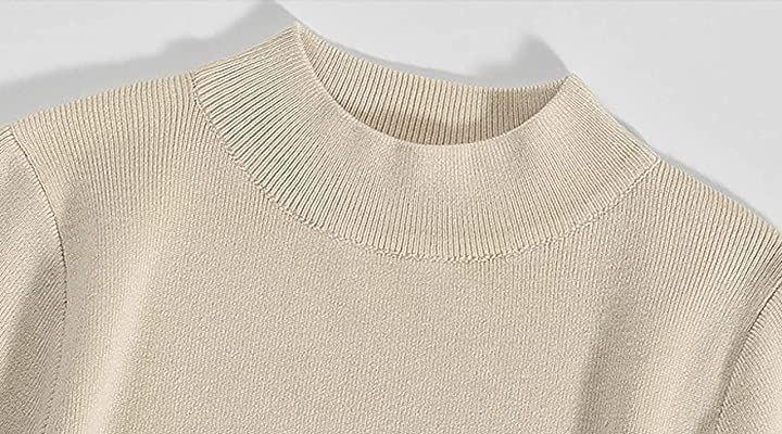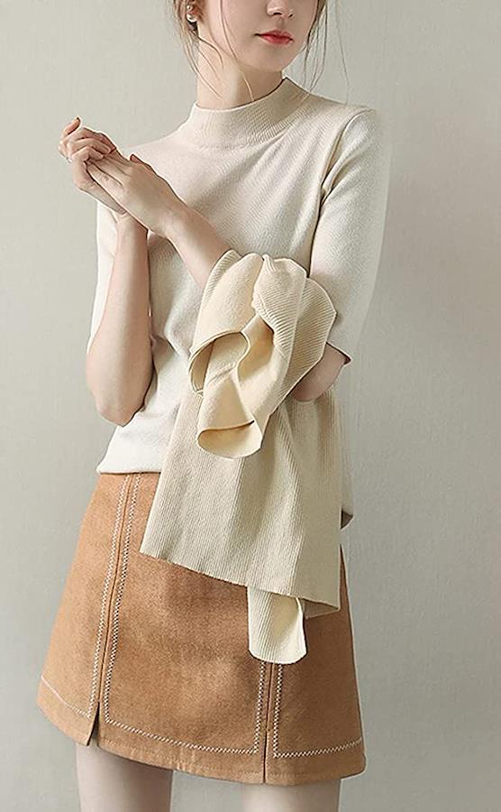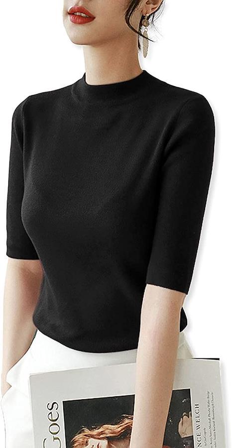 ・ボディラインに優しくフィットするシルエットでキレイに着こなせる五分袖ハイネックニットトップス。