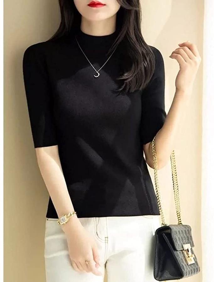 ボディラインに優しくフィットするシルエットでキレイに着こなせる五分袖ハイネックニットトップス。