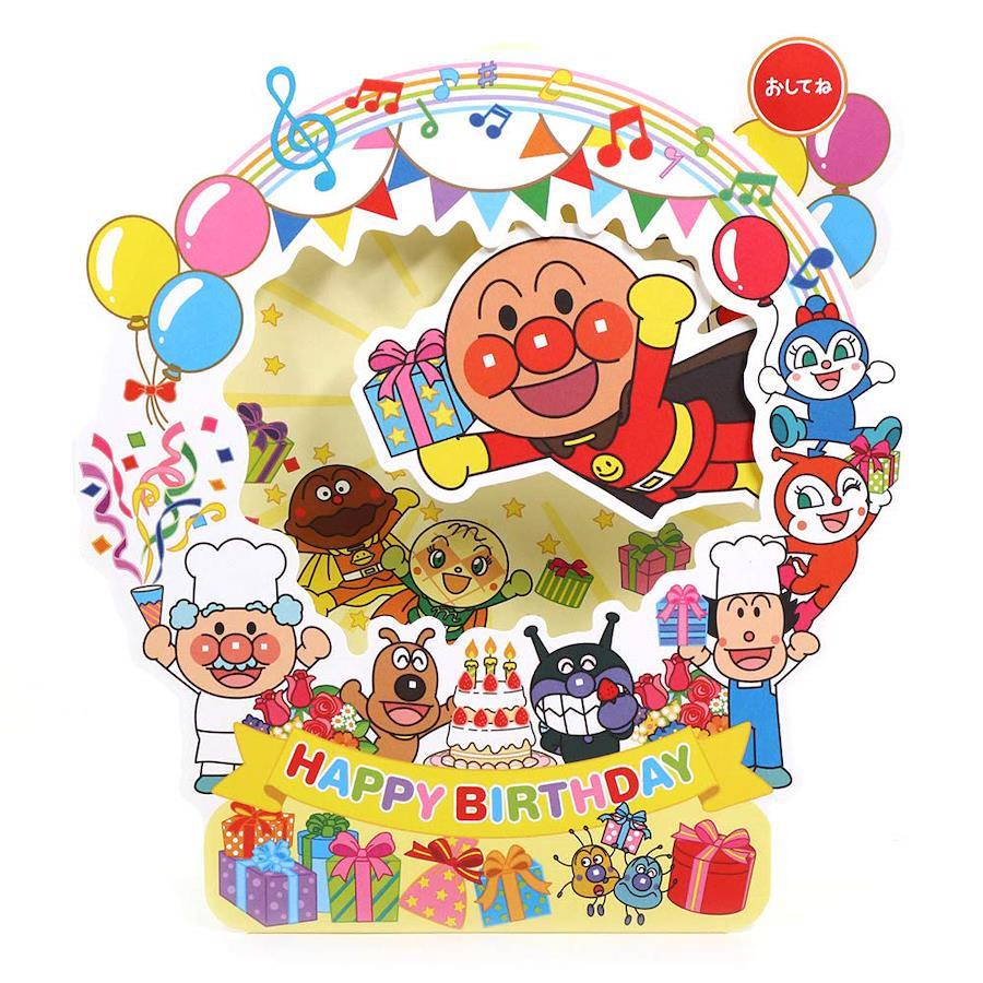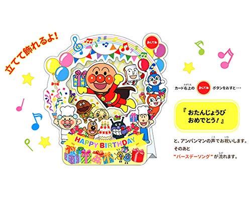 お子さまへの誕生お祝いに! ボタンを押すと、アンパンマンのセリフとバースデーソングが流れるオルゴールカードです。色とりどりの風船やプレゼントが描かれたにぎやかなデザインです。