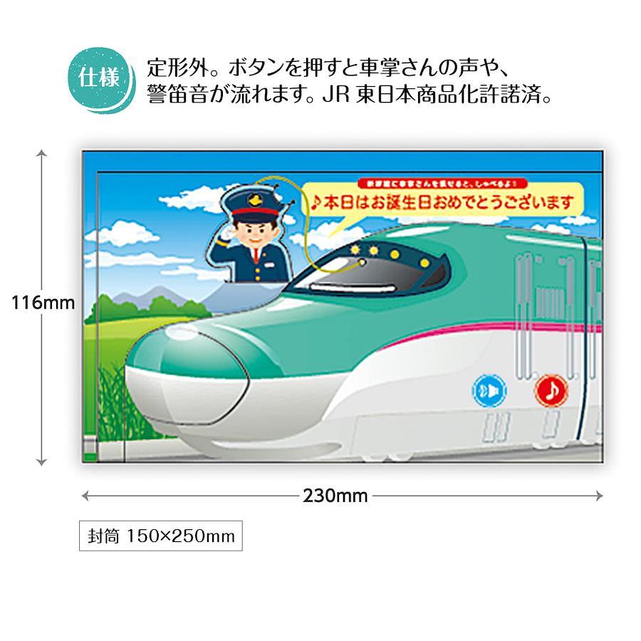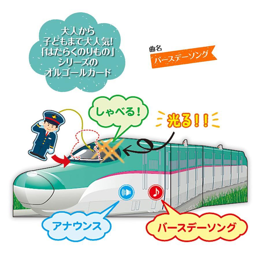 ・差して、押して遊べる!新幹線「はやぶさ」のオルゴールカードです・新幹線の運転席に車掌さんを差し込むと、車内アナウンス風のセリフと警笛音、発車メロディー風のバースデーソングでお誕生日をお祝いします 【サイズ】カード:116×230mm 封筒:150×250mm 【仕様】定形外、立てて飾れます、曲名:バースデーソング、ボタンを押すと車掌さんの声や、警笛音が流れます、JR東日本商品化許諾済 【特徴】大人から子どもまで大人気!「はたらくのりもの」シリーズのオルゴールカード
