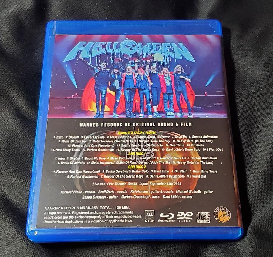 バンド初となる武道館公演が話題沸騰中のハロウィンのジャパン・ツアー2023より、9月14日、大阪公演・オリックス劇場での感動的で圧巻のパフォーマンスをNANKERレーベル独自のフルHDオリジナル・フィルムを使用した安定感抜群の超美麗オーディエンス映像にて、白熱したライブをノーカット130分に渡りブルーレイRに完全収録。同映像のDVDRの付属と音圧豊かなステレオ感抜群の高品質なオーディエンス録音CDR付。(映像の音声にも使用しています。) 手振れや煩わしいオーディエンスの障害物等一切なしの3階最前列からのアンディ・デリス、マイケル・キスク両ヴォーカルのズーム・ショットやカイ・ハンセン、マイケル・ヴァイカート、サシャ・ゲルストナーのトリプル・ギター陣の凄まじいプレイを的確に捉えた映像などワンカメ・ショットながらステージ全体を捉えた映像やズーム・ショットなどを織り交ぜた飽きさせない臨場感溢れる多彩なショットにて完全収録。カイ・ハンセンとマイケル・キスクがバンドに復帰し、7人体制になって初のアルバム「Helloween」から「Skyfall」「Mass Pollution」「Best Time」の3曲を披露。アンディ・デリス、マイケル・キスク、カイ・ハンセンの歴代ヴォーカリストの素晴らしい歌声と共にそれぞれの名曲が蘇る。関西のファンを魅了したハロウィンのパワフルでエネルギッシュな大阪公演での圧巻のパフォーマンスを音と映像で存分にお楽しみ頂けます。買って損なしのお薦めのアイテムです。
