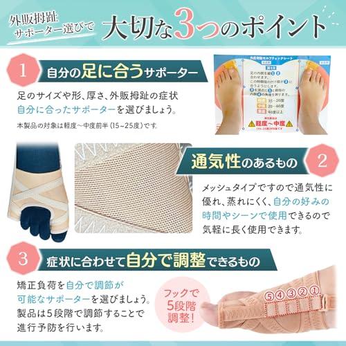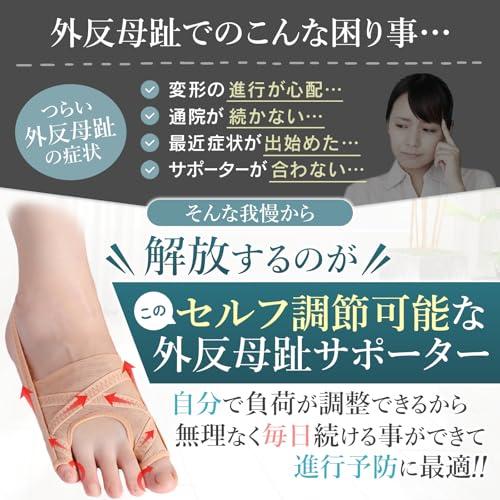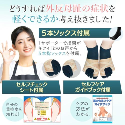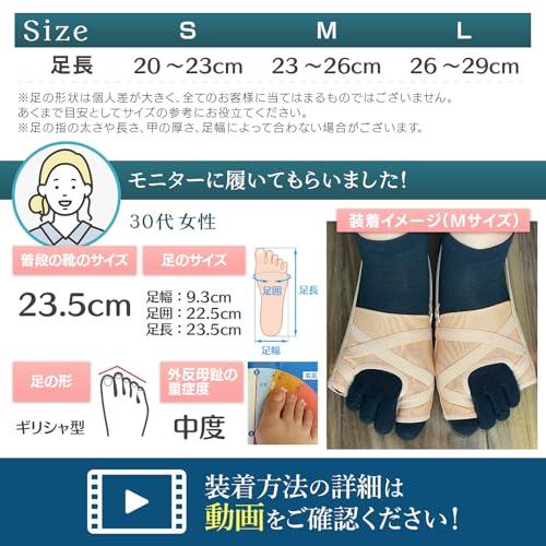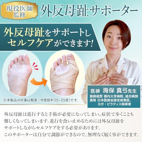 ?????【医師監修】自身も軽度の外販拇趾の現役医師が監修。予防医学的見地から考えて、重度の外販拇趾への進行を予防する外反母趾サポーターです。 ??【内容品】外反母趾サポーター2枚、セルフチェックシート1枚、セルフケアガイドブック1冊、5本指ソックス2枚 ??【人体構造原理から開発】足の甲部分をゴムベルト二枚で加圧し、中足関節を閉めると指が開く原理を利用し、外反母趾と内反小趾を同時にサポートする構造です。 ??【矯正強度を自己調整可能】側面に5段階の留め穴があるので、矯正強度を5段階で調整可能です。自分の足の状態に合わせて最も快適な位置に牽引の強度を調整してください。 ??【ベルトでズレ防止】かかと部分にベルトがついているため、使用時のズレを防ぎます。 ?【ご注意】足の形・サイズ・外反母趾の症状は千差万別です。サイズが合わない場合は、無料で交換いたします。お気軽にご連絡ください。 ?【ご使用方法】付属の5本指ソックスを履いてから外反母趾サポーターを装着してください。5本指ソックスを履かない場合に指の間に痛み症状が発生する場合があることが報告されております。