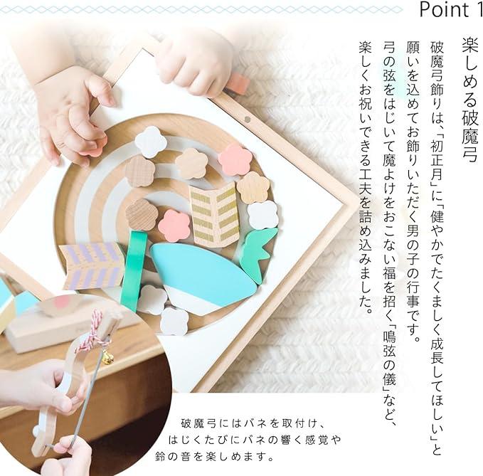 ■商品説明?【2024年新作/男の子の初正月に】プーカシリーズに男の子のお正月のお祝いを彩る破魔弓が仲間入り。パーツには縁起のよいモチーフがたくさん。松竹梅や流鏑馬の射手、矢には四方を守護するという意味をこめました。弓の弦をはじいて魔除けをおこない、福を招く「鳴弦の儀」など、楽しくお祝いできる工夫をたくさん詰め込みました!?【お名前プレートサービスつき】商品お届け後に、同封のハガキに必要事項をご記入いただき投函ください。2-3週間程度でお名前の入ったプレート(富士山)がメーカーから届きます?【お届け内容】松、竹*2、お花(ピンク)*4、お花(無垢)*4、お花(白)*5、矢羽根(蒼・白・赤・紫)、弓、白鷹、射手、フレーム、台/富士山パーツは商品に同封のハガキをご返送いただいたらお送りします/※射手は表が青、裏が黄色です ※あとからお届けする富士山パーツは裏が日の丸扇です?【サイズ】全体 縦置き:約幅20×奥行き12×高さ21.4(cm)?【素材】木材ほか?もっと見る