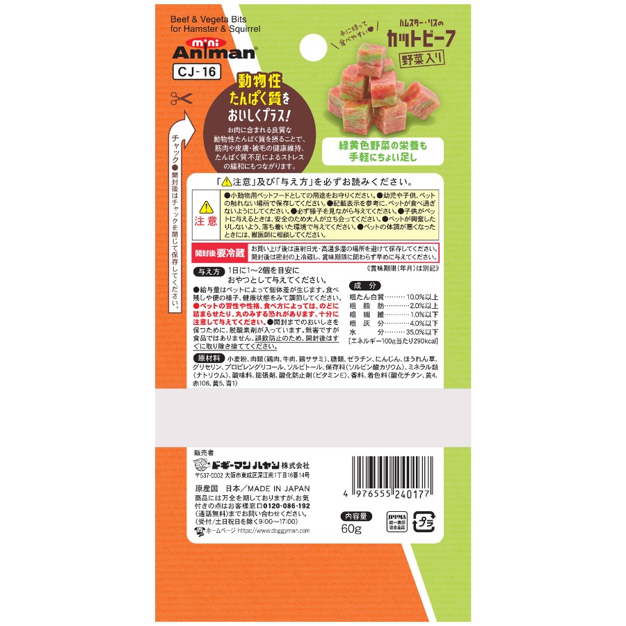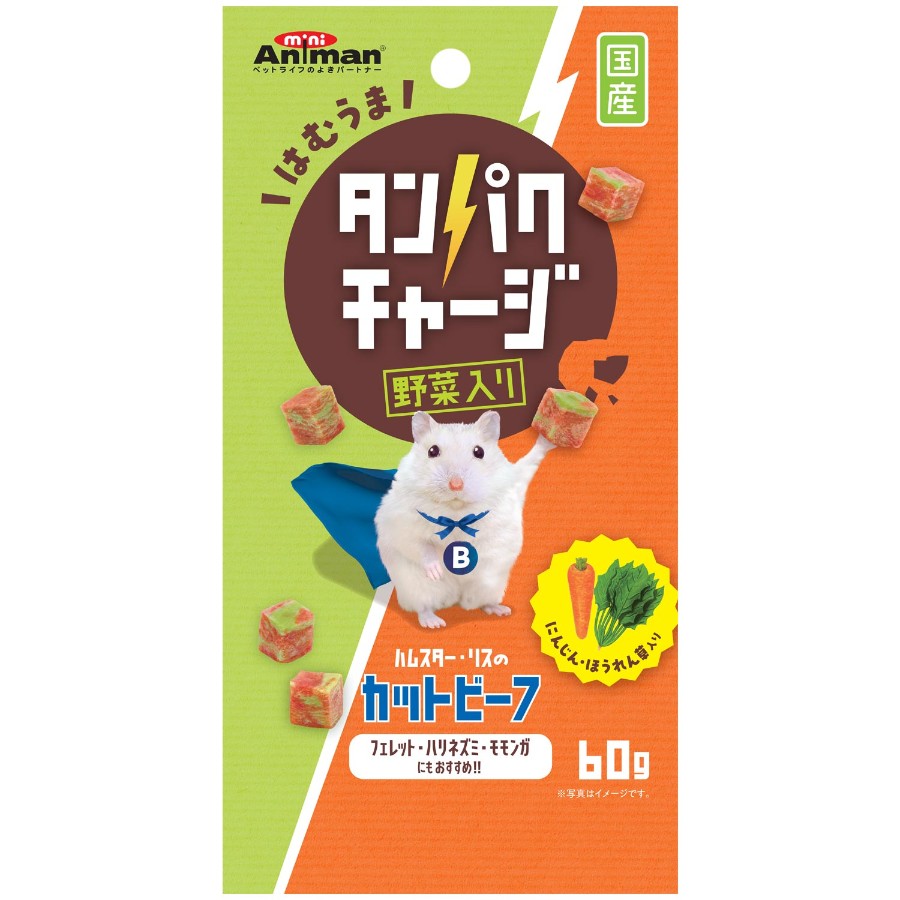 ・おいしいビーフを、ハムスター・リスが手に持って食べやすい大きさのキューブ型にカット!・ハムスター・リスにも必要な 動物性たんぱく質が摂取できます。・動物性たんぱく質を含む肉類に、ほうれん草、にんじんを配合したおやつ。