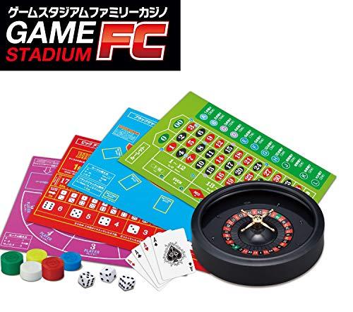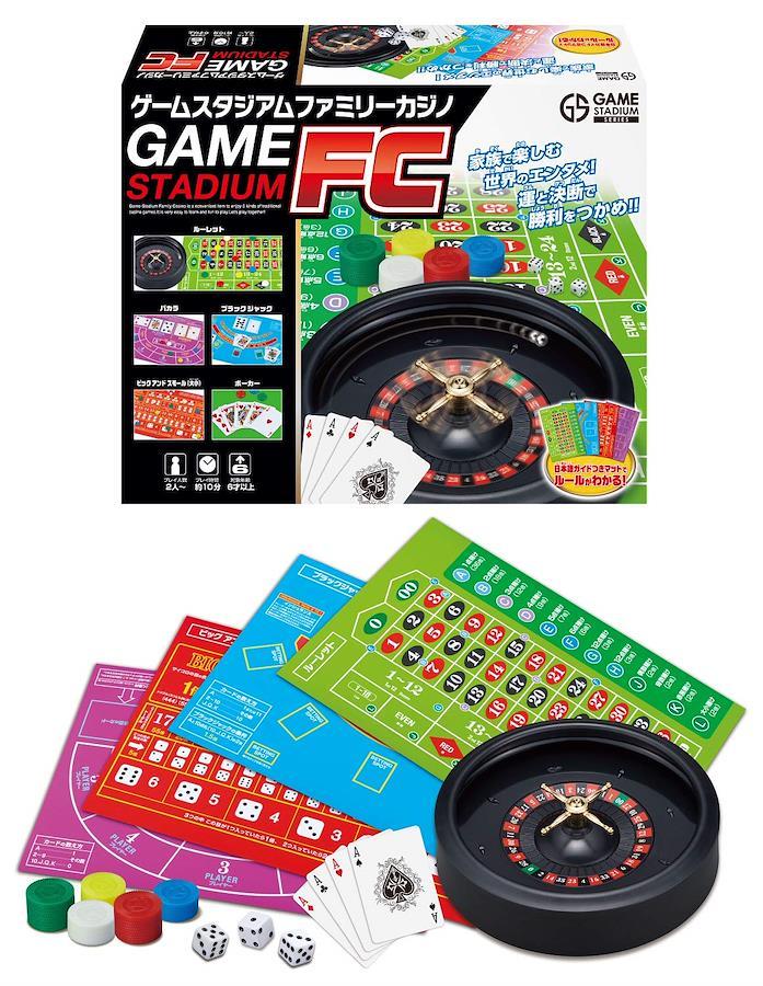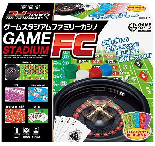 ゲームスタジアムシリーズに「カジノ」が仲間入りしました!家族みんなで楽しめるファミリーカジノセットです☆「ルーレット」・「バカラ」・「ビック&スモール」・「ブラックジャック」・「ポーカー」5種類のカジノゲームが楽しめます。【遊び方】●ルーレット38カ所のスポット(1~36、0、00)がある回転盤へディーラー(銀行役)がボールを投げ込み、そのボールがどの番号に入るかを予想するゲームです●バカラディーラー(銀行役)が「PLAYER」と「BANKER」の2カ所にカードを配り、そのカードに描かれた数の合計の下一桁を見て、どちらが9に近いかを予想するゲームです。●ビック&スモールダイスを3個振り、その3個がどのような目になるかを予想するゲームです。●ブラックジャックこのゲームではディーラー(銀行役)とプレイヤーによるカードゲームが楽しめます。カードを配りそれらのカードに描かれた数の合計が21を超えずに21に近い方が勝ちとなります。●ポーカープレイヤー同士によるカード対決ゲーム!それぞれのプレイヤーに5枚ずつのカードが配られますので、それらで役を作ります。【セット内容】ルーレット1台、ゲームマット2枚、トランプ54枚、サイコロ3個、チップ50枚、鉄玉2個、取扱説明書1部(.co.jpより) 生産国:中国 対象年齢 :6才以上 梱包サイズ:29.0cm×9.0cm×37.0cm