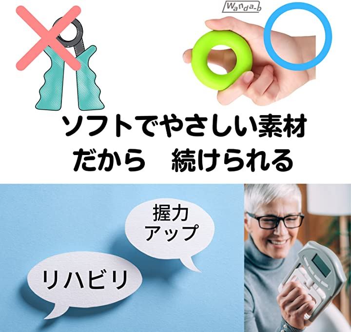 このシリコン製器具での筋力アップは、怪我や病気のリハビリ目的の場合でも使えるようソフトでやさしい素材を使用していますので、どなたでもお手軽にたのしくトレーニングできます。