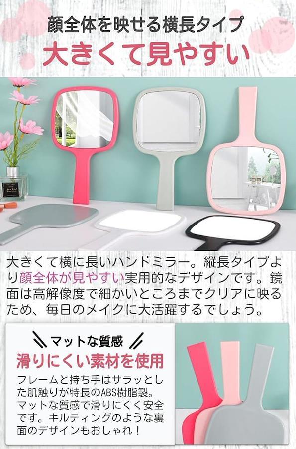 「商品特徴」 大きくて見やすい:顔全体を映せる大きくて横長のデザイン 肌触りの良い素材:フレームと持ち手は滑りにくい素材 2サイズから選べる:用途にに合わせてL・Mの2サイズから選べる 豊富なカラー展開:落ち着いた色合いの6色をご用意