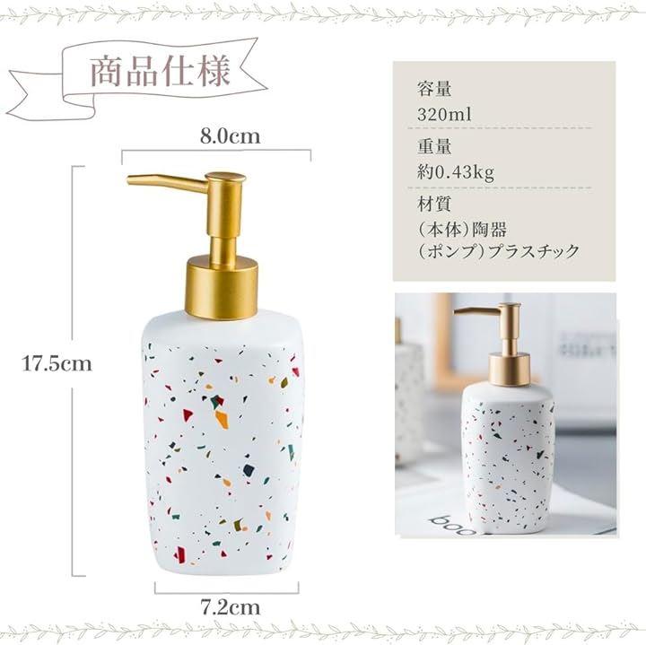 「サイズ」容量:320ml、重量:約0.43kg、幅7.2x高さ17.5cm「材質」ボトル:陶器、ポンプ:プラスチック、ボトル本体周辺:ゴム塗装、 高級感のある磁器のセラミック製のディスペンサーです。