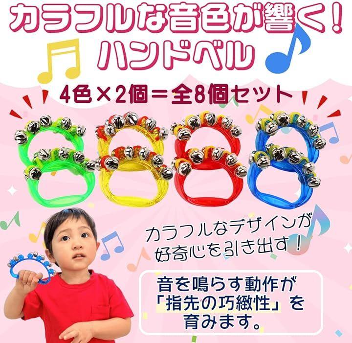 「商品詳細」<ハンドベル(リングベル)>サイズ:約10x8cm / 材質:プラスチック・金属 / カラー:レッド・イエロー・グリーン・ブルー 各2個(計8個)<木製カスタネット>サイズ:直径約5cm / 材質:木材 / カチッと響く明るいサウンド<セット内容> ハンドベル8個+木製カスタネット8個(計16点)音色の違いをしっかり楽しめるセットで、幅広い音楽活動に対応します。