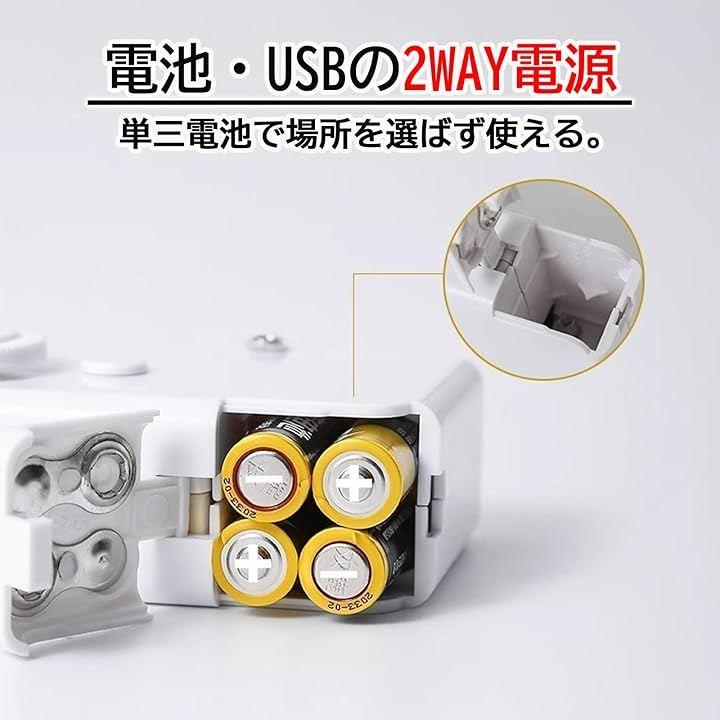「単三電池・USBの2WAY電源対応」 単三電池(4本)で場所を選ばず使用でき、USB給電にも対応。