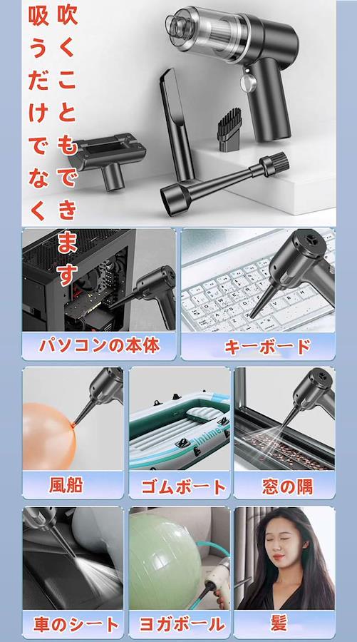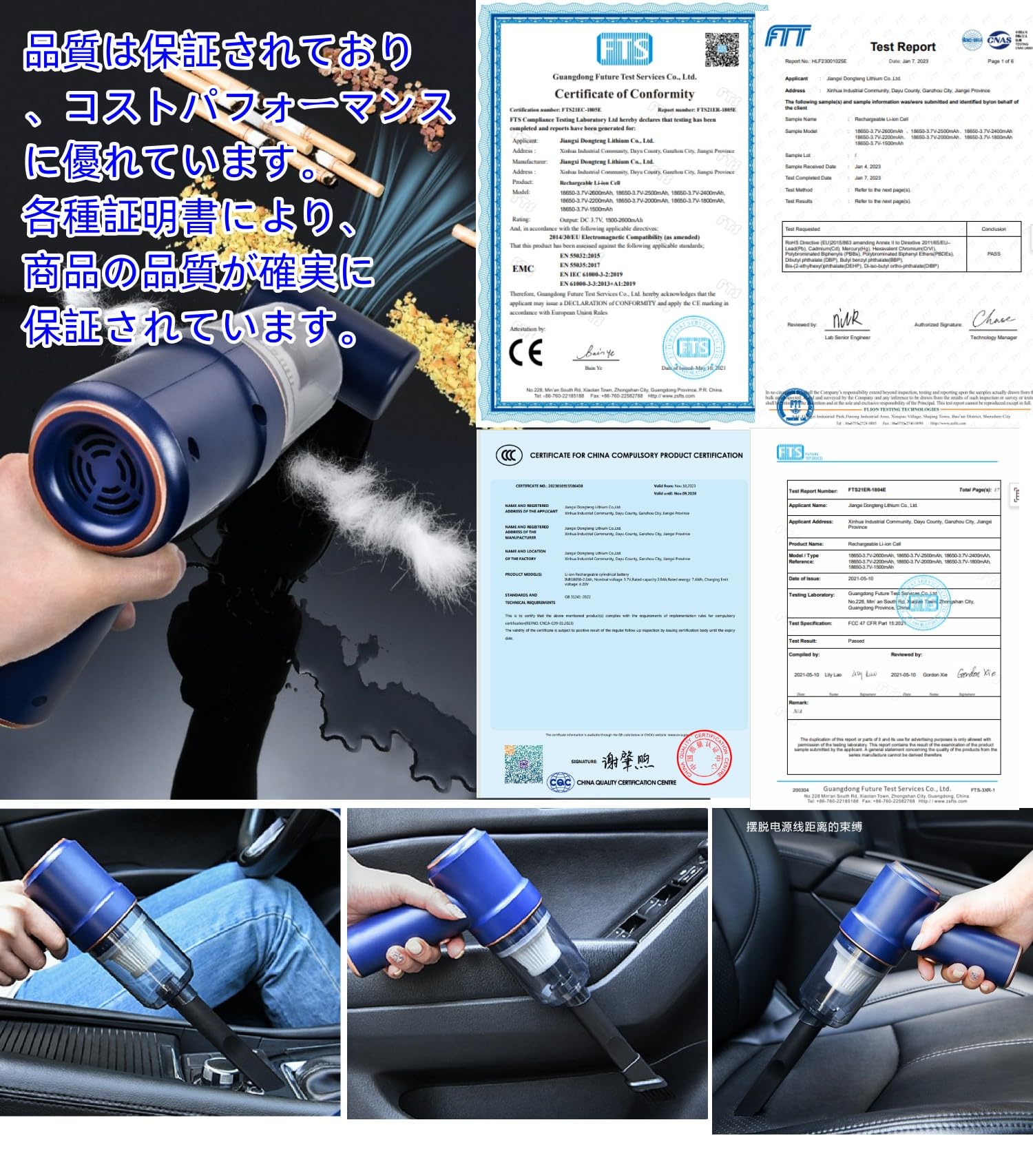 3営業日以内に発送≪新品未開封品≫【新品未開封品】【多機能かつ超軽量の車用掃除機】 本製品には、使用目的に応じて交換可能な6種類のノズルが付属しております。更に高密度のHEPAフィルター(交換用)三つが付属しております。長い隙間ノズルを使用することで、ベッド下やブラインドの間、車のドアの隙間などの埃を容易に除去することが可能です。平型ノズルは、主に布製のソファ、寝具、車内マットの表面清掃に適しております。また、3in1の着脱式ノズルは、床や卓上、カーテンなど、幅広い日常生活のシーンでご使用いただけます【ブラシレスモーター搭載・超強力モーター】 本車用掃除機はブラシレスモーターを採用しており、従来のブラシモーターと比較して、長寿命、低騒音、電磁ノイズの低減、省エネルギー、高効率、メンテナンス性に優れた利点を有しています。また、アップグレードされた超強力モーターにより、最大19000Paの強力な吸引力を実現し、細かなゴミまでしっかりと吸い取ります。場所を問わず、どこでも簡単にご使用いただけます。CITER【4000mAh大容量バッテリー・Type-C充電対応・LED照明搭載】 本製品は4000mAhの大容量リチウムバッテリーを搭載しており、長時間使用が可能です。理想的な条件下では、約2時間で充電が完了し、20分間の連続使用が可能です。また、このハンディ掃除機 フィルター動作音は60dB以下と静かで、内蔵のLEDライトにより、暗い場所でもゴミやホコリを明確に確認でき、室内清掃をより一層簡単に行うことができます。【HEPAフィルター&三つ付属】 本車載掃除機には、高精度なHEPAフィルターが搭載されており(本体1つ付き、予備用二つ付き)、微細なホコリや不純物を効果的に除去します。ホコリや花粉、その他のゴミをしっかりと捕らえ、清潔な空気を排出することが可能です。フィルターは簡単に取り外せ、水洗いするだけで繰り返し使用できるため、手入れも容易です。【シュリンク包装・コンパクト】 弊社のハンディクリーナーはシュリンク包装を採用しており、商品を保護するとともに、光沢のある美しい外観を実現しています。軽量でわずか0.36Kgのため、片手で握りやすく、掃除の際の腕への負担を軽減します。また、敬老の日、父の日、母の日、誕生日、クリスマス、お歳暮などの贈り物にもおすすめです。【7種類のアタッチメント】 本製品は車内および自宅で兼用可能です。異なる用途に対応するために、7種類の交換用アタッチメントを備えています。パッケージ内容は以下の通りです:車載掃除機×1、アタッチメント×7、USB充電ケーブル×1、フィルター×3、掃除用ブラシ×1、日本語取扱説明書×1。