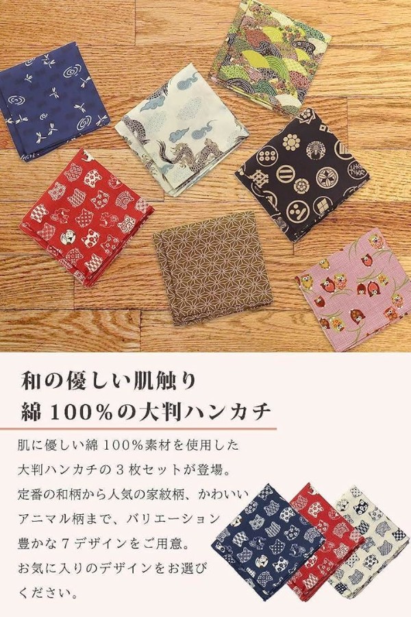 肌に優しい綿100%素材を使用した大判ハンカチの3枚セット。