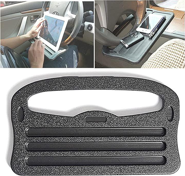 ・v「カーテーブル」車の運転席でノートパソコンやタブレットを広げて仕事をしたり、食事用のテーブルとして簡単にサッと出してハンドル(ステアリングホイール)に固定して利用出来る、車載テーブル、パソコンデスク、ランチプレートです。