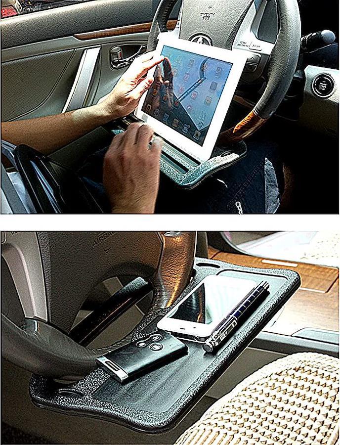 *「カーテーブル」車の運転席でノートパソコンやタブレットを広げて仕事をしたり、食事用のテーブルとして簡単にサッと出してハンドル(ステアリングホイール)に固定して利用出来る、車載テーブル、パソコンデスク、ランチプレートです。