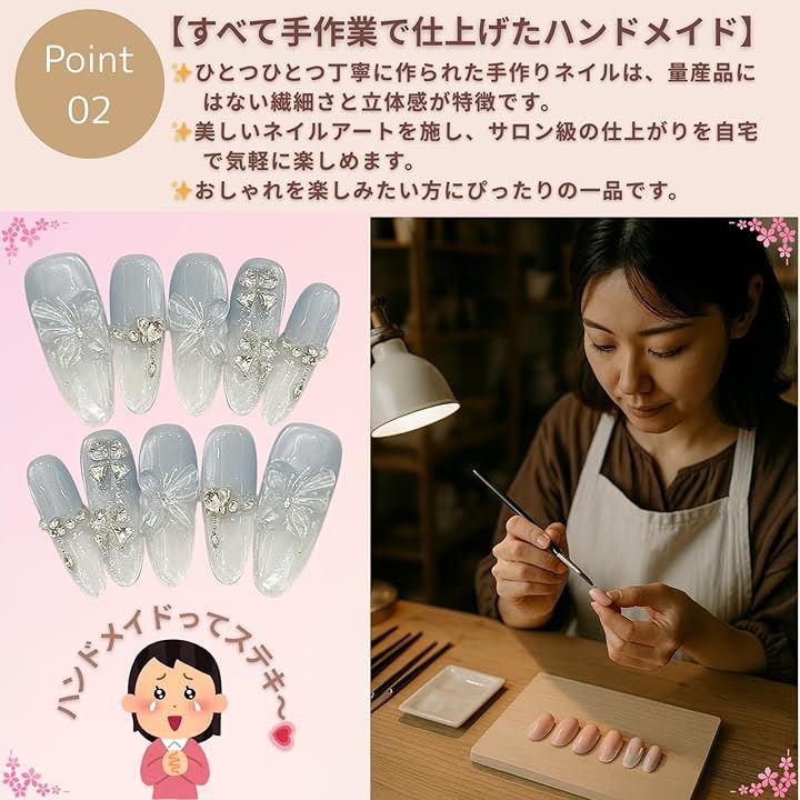 「すべて手作業で仕上げたハンドメイド」ひとつひとつ丁寧に作られた手作りネイルは、量産品にはない繊細さと立体感が特徴です。