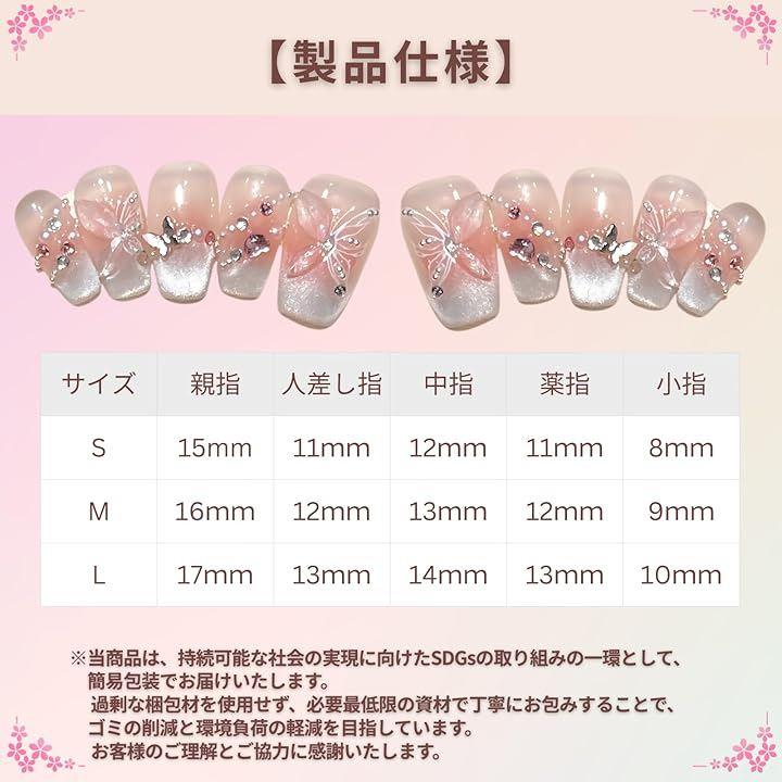 「製品仕様」パッケージサイズ:縦8.4cmx横8.3cmx厚さ1.9cm、重量:30g、セット内容:ネイルチップ10枚 *当商品は、持続可能な社会の実現に向けたSDGsの取り組みの一環として、簡易包装でお届けいたします。