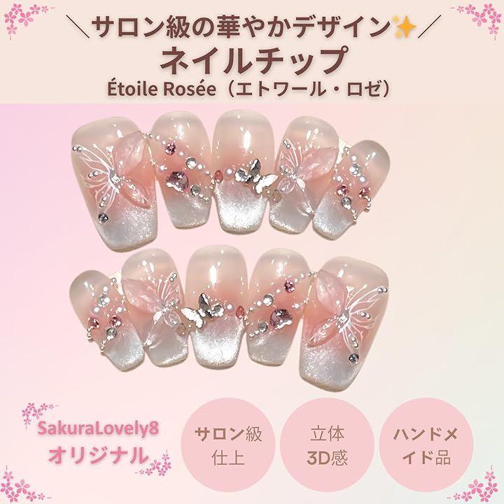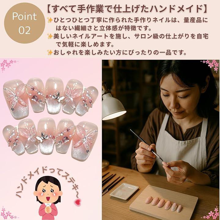 「すべて手作業で仕上げたハンドメイド」ひとつひとつ丁寧に作られた手作りネイルは、量産品にはない繊細さと立体感が特徴です。