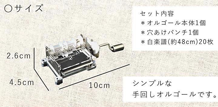 サイズ:オルゴール(1個) 約10cmx4.5cmx2.6cm 譜面紙(20枚) 約48cm 譜面用パンチ(1個) *発注時に若干の仕様・見た目の色・サイズ等の変更はありますのでご容赦ください。