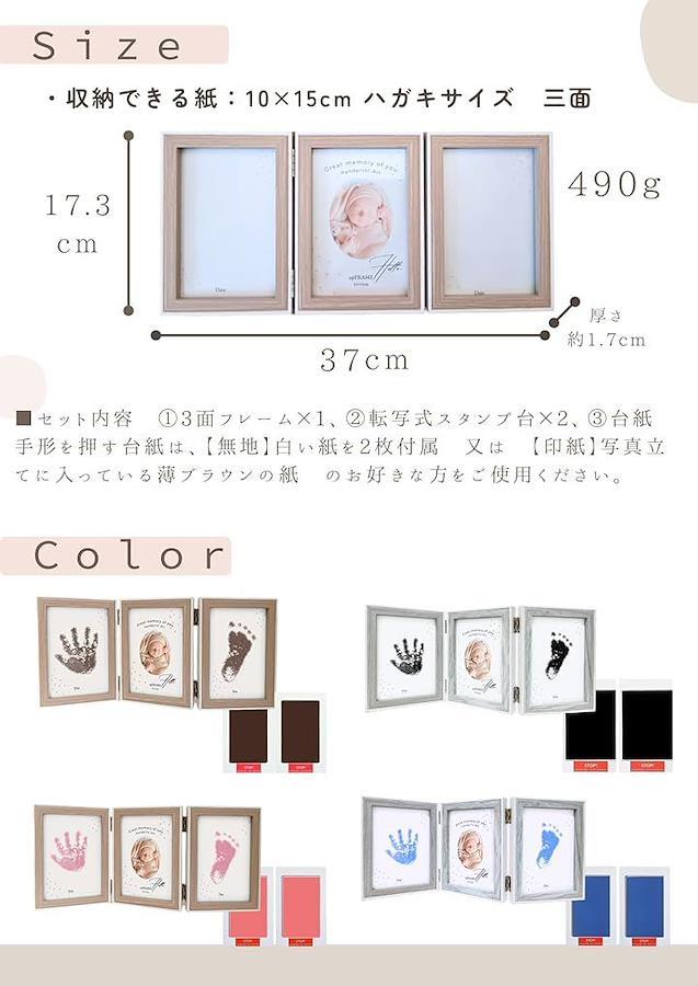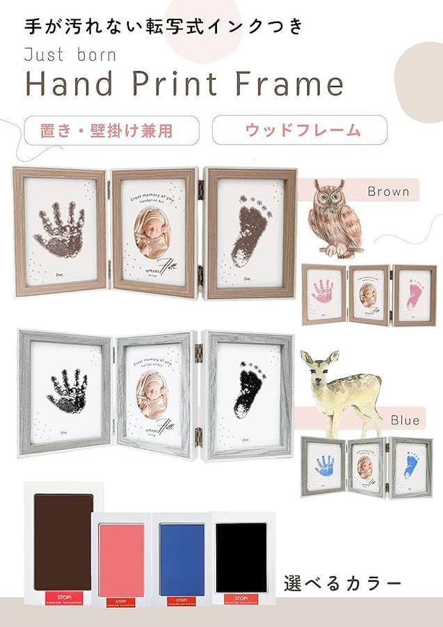 軽量フレームで安心、インクパッド式で簡単、そしてなんといっても素敵なカラーが選べることが特徴です ピンク ブルー ブラウン ブラック どのカラーもとてもかわいいのでおすすめです フォトフレーム 手形スタンプ 赤ちゃん 写真立て 汚れない 手形足形 置き掛け兼用 ベビーフレーム 出産祝い 命名書 ベビー用品 ジャストボーン