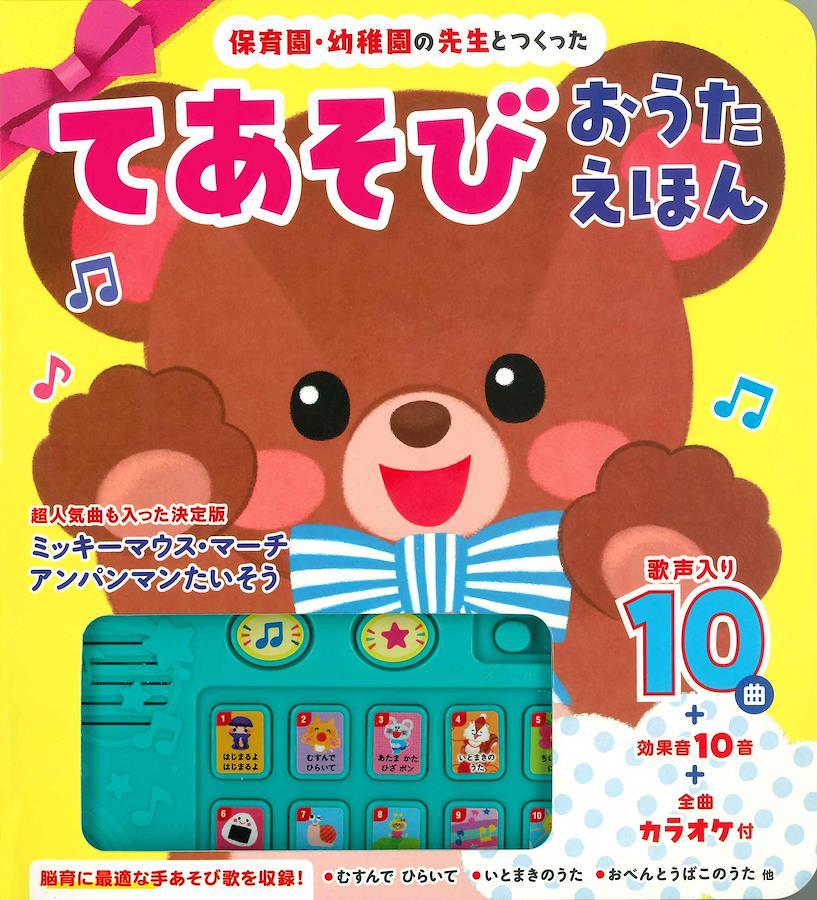 保育園・幼稚園の先生と選曲したどうようのIC絵本。「むすんでひらいて」「あたま かた ひざ ポン」「いとまきのうた」「おべんとうばこのうた」といった馴染みある曲に加え、アンパンマンたいそう、ミッキーマウス・マーチなど体操もできる超人気曲も入った歌声10曲入。効果音10音でリズム遊びもでき、全曲カラオケもついています。ボリュームも大小の調節ができ、同型の絵本の中でもハイスペックなつくりです。